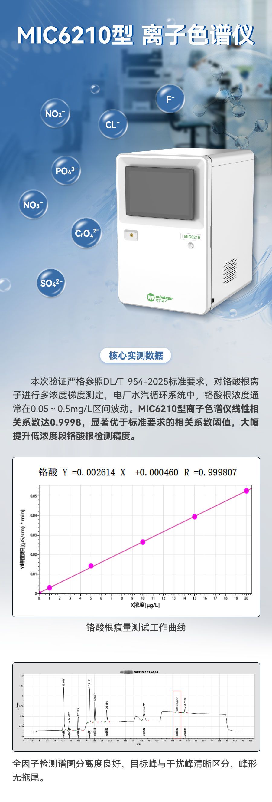 2025年12月30日,DL/T 954-2025《发电厂水汽试验方法 阴离子的测定——离子色谱法》正式实施,新增的铬酸根离子检测要求让众多电力实验室面临技术升级压力。明华电子紧跟标准更新步伐,针对该新增指标,使用MIC6210型离子色谱仪开展专项测定验证,实测结果显示——线性相关性表现良好,可完全适配新标准检测需求。