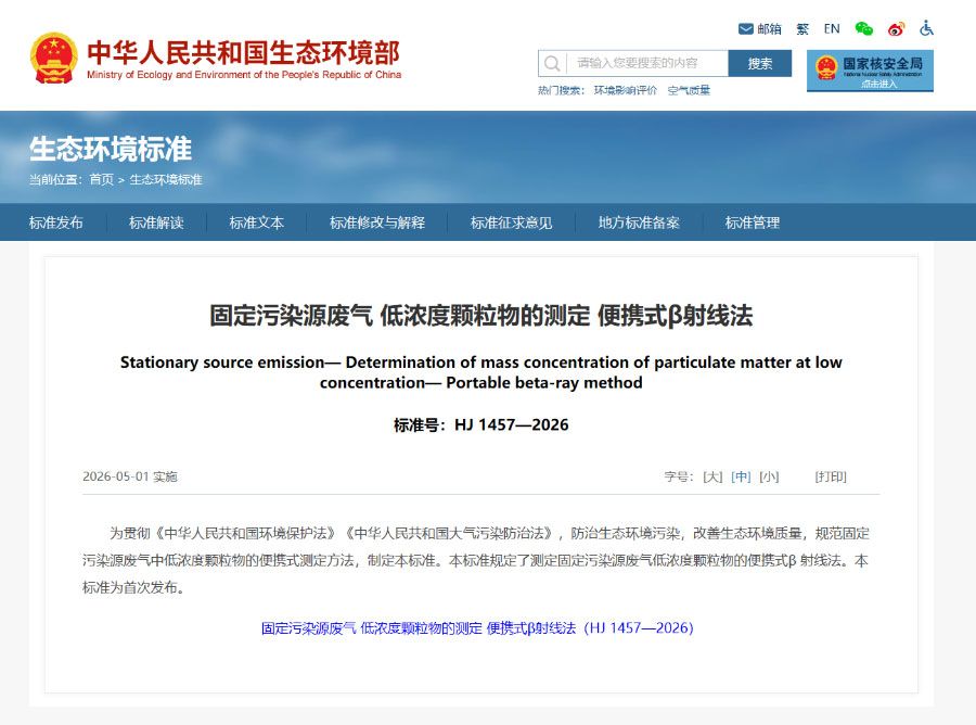 近日,生态环境部发布HJ 1457—2026《固定污染源废气 低浓度颗粒物的测定 便携式 β 射线法》,该标准将于2026年5月1日正式实施。标志着固定污染源废气低浓度颗粒物测定正式跨入直读时代,标准的“首次发布”属性表明我国在低浓度颗粒物便携监测领域已具备自主创新能力。