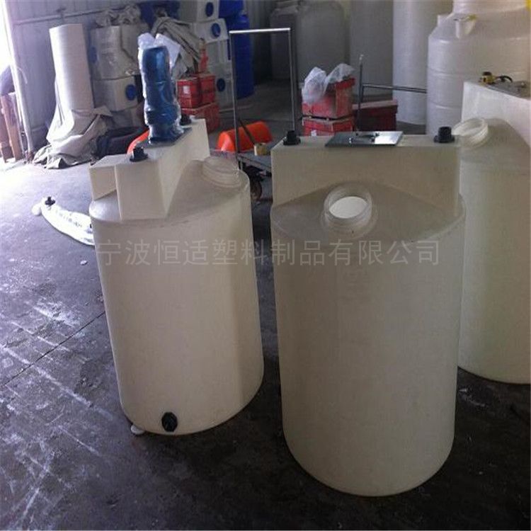 2.水 处理应用:加药桶在水处理工程中加药桶主要用于各种药剂的搅拌、溶解、储存,再通过计量泵或水射器将药液投加到各投加点。 加药桶外形分为方形和圆形,材 质为聚乙烯(PE),通过滚塑技术一次成型,上部预设了计量泵及搅拌机的安装位置,搅拌机、加药桶、计量泵三合一,使用非常 方便。 提示:加药桶预设的 计量泵及搅拌机安装位置,并不完全通用于所有品牌、型号的计量泵及搅拌机,具体安装时需要由客户根据实际情况作出相应调整。
