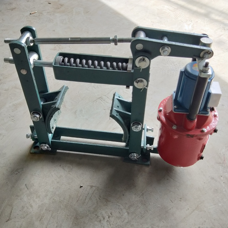 制动器由磁轭、励磁线圈、弹簧、制动盘、衔铁、花键套、安装镙钉等组成,制动器安装在设备的法兰盘(或电动机)的后端伸;传动轴与花键套与制动盘联结。制动器的励磁线圈接通额定电压(DC)时,电磁力吸合衔铁,使衔铁与制动盘脱离(释放),这时传动轴带着制动盘正常运转或启动,当传动系统分离或断电时,制动器也同时断电,此时弹簧施压于衔铁,迫使制动盘与衔铁及法兰盘之间产生摩擦力矩,使传动轴快速停转。在制动器散热环境较差,传动轴又是长时间连续工作时,如果条件允许,则可在制动器工作后,保持电压转换为70%-80%的额定电压,以减少发热。