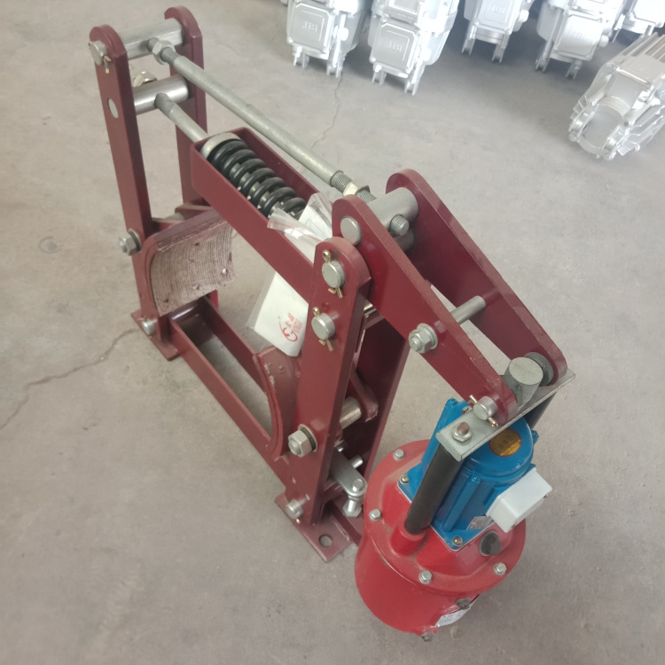 起重机用制动器由制动瓦块、制动臂、制动轮和松闸器组成。常把制动轮作为联轴器的一个半体安装在机构的转动轴上,对称布置的制动臂与机架固定部分铰连,内侧附有摩擦材料的两个制动瓦块分别活动铰接在两制动臂上,在松闸器上闸力的作用下,成对的制动瓦块在径向抱紧制动轮而产生制动力矩。
