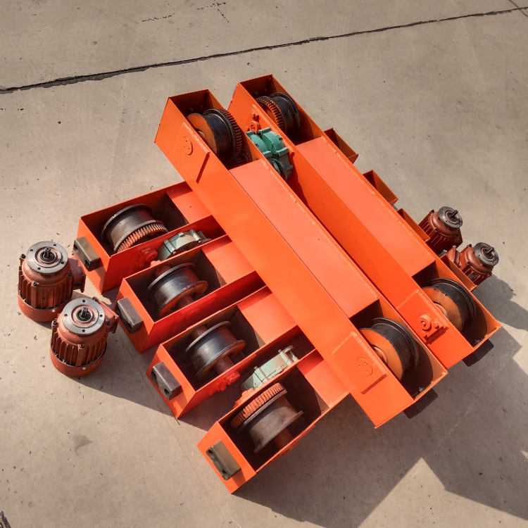 起重机端梁是指起重机的大车运行部分,与主梁连接,就是起重机大梁两端有四个轮子的地方,一边是两个轮子,一个主动轮,一个从动轮。