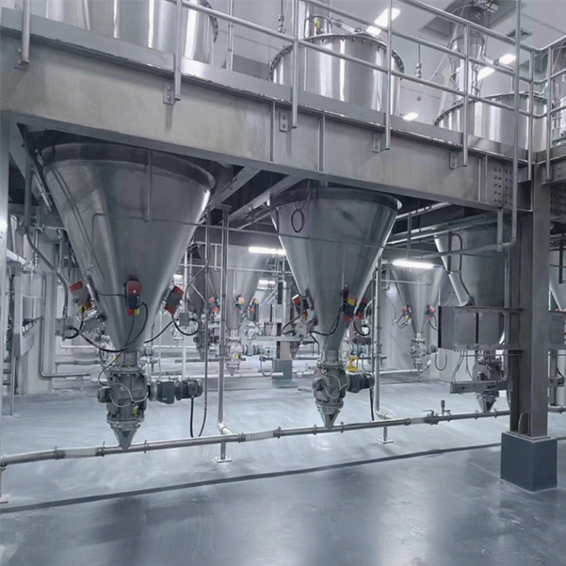 双螺旋锥形混合机筒内两只非对称螺旋自转将物料向上提升,转臂慢速公转运动;使螺旋外的物料不同程度进入螺柱,从而达到全圆周方位物料的不断更新扩散,被提到上部的两股物料再向中心凹穴汇合,形成一股向下的物料流,补充了底部的空缺,从而形成对流循环的三重混合效果;标准型锥形螺旋混合机有两根搅拌螺旋,实际应用中根据设备规格大小可以采用单(一根长螺旋)、双(长短各一两根不对称螺旋)、三(两短一长对称布置)根螺旋;理论上搅拌螺旋越多,混合效果越好;设备一般采用梅花状“错位阀”,此阀与长螺旋底部贴合紧密,有效减少混合死角,驱动形式有手动和气动可选;根据用户需要,也可加装蝶阀、球阀、星形卸料器、边出料等。