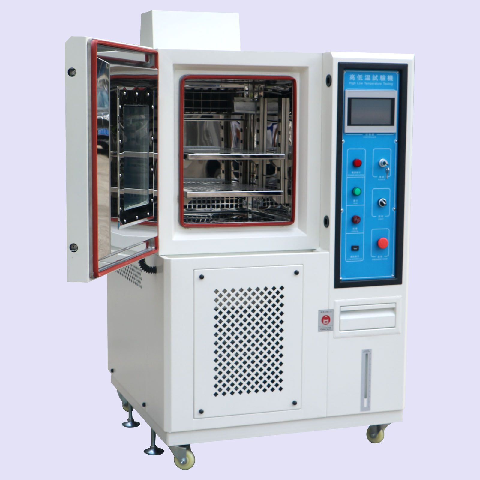 标准配置 耐高、低温钢化玻璃内热式中空玻璃观察窗:300×200(mm)一个,照明灯一只测试引线孔¢50mm一个,样品架2付,测试引线孔1个,脚轮一套
