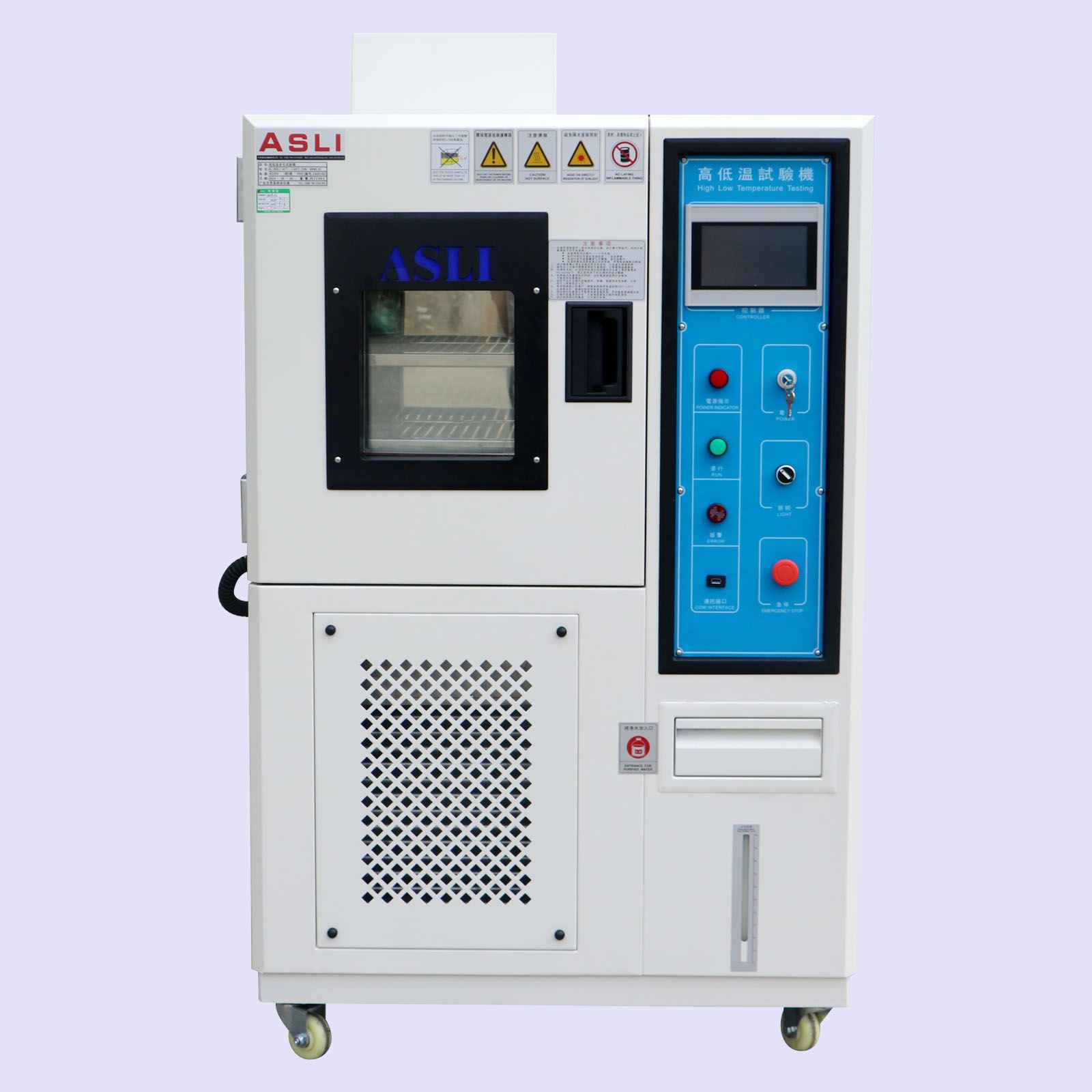 ASLI非标定制不锈钢恒温恒湿试验箱的工作原理主要由调温(加温、制冷)和增湿两部分组成。通过安装在箱体内的旋转风扇,将空气排入箱体,实现气体循环、平衡箱体内的温、湿度。由箱体内置的温、湿度传感器采集的数据,传至温、湿度控制器进行编辑处理,下达调温、调湿指令,通过空气加热单元、冷凝管以及水槽内加热蒸发单元的共同完成。