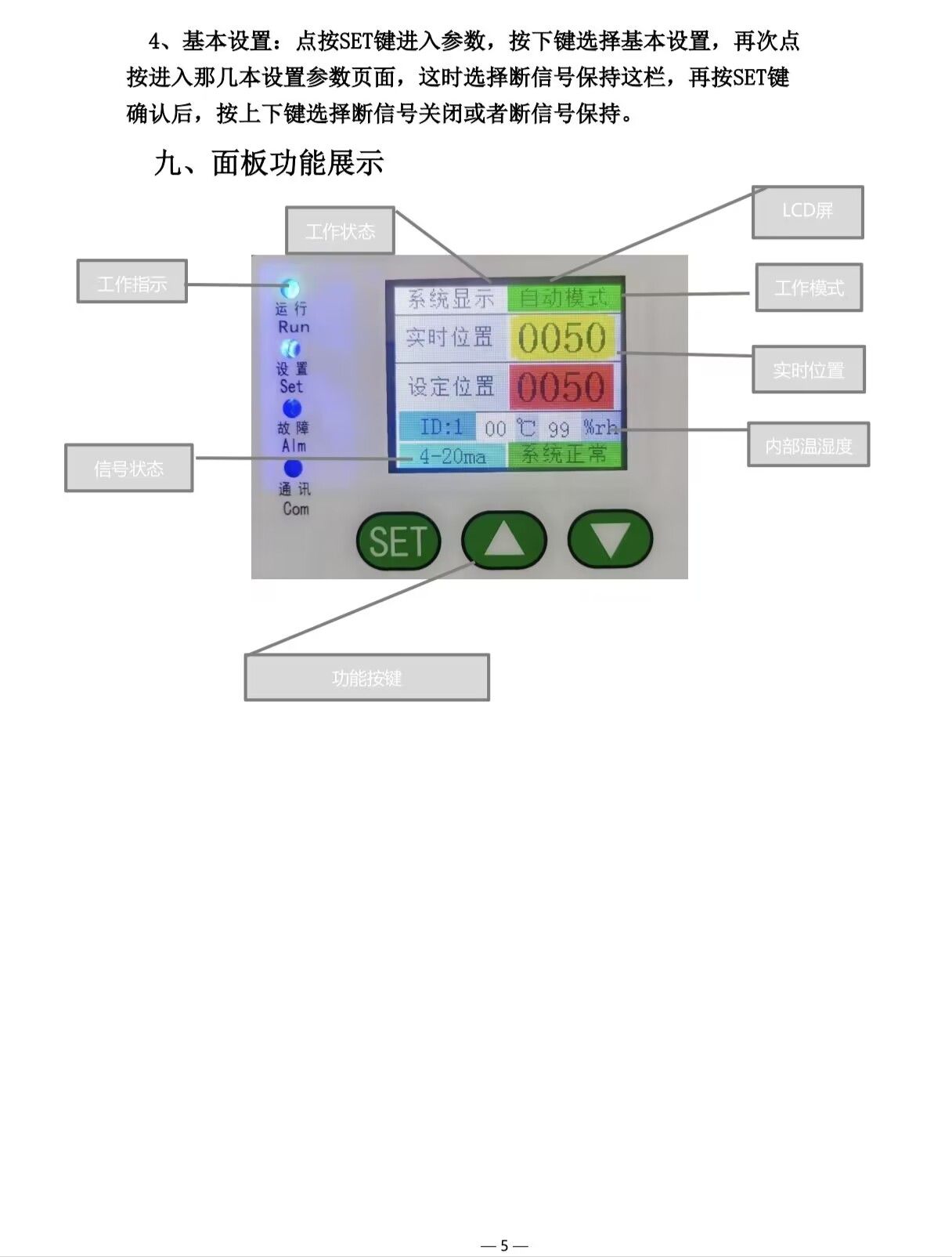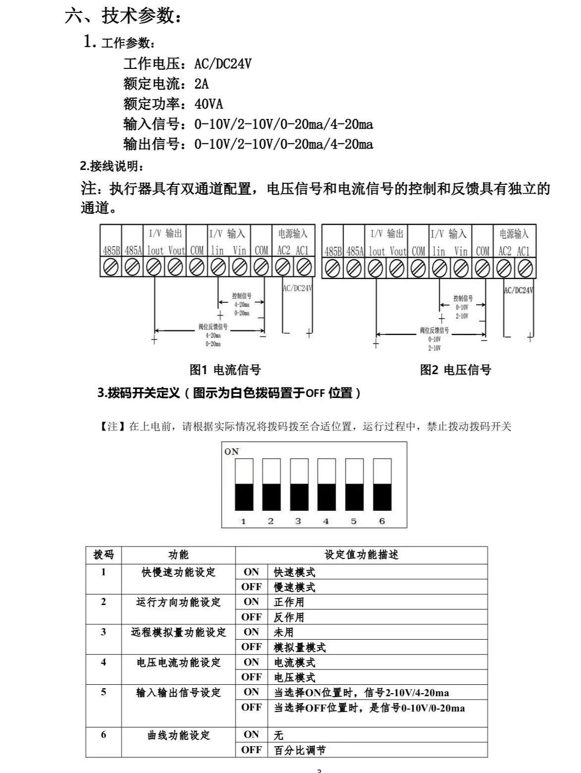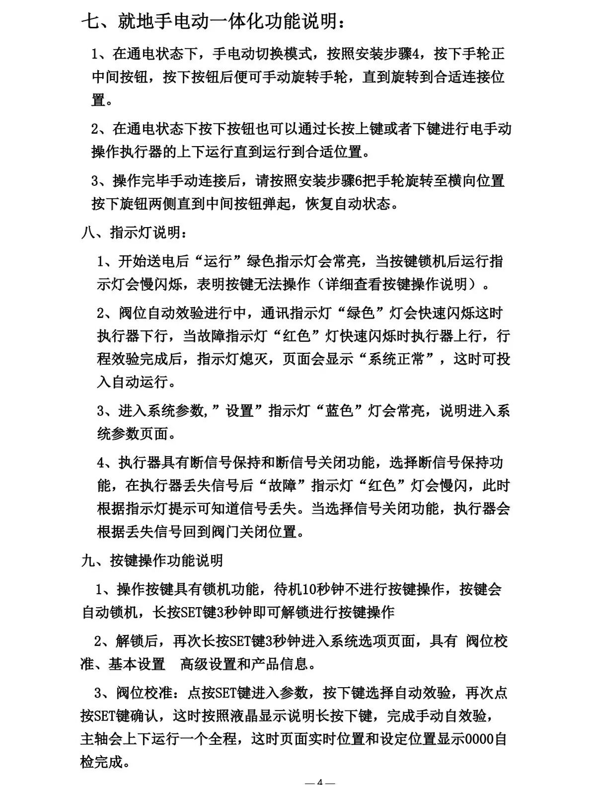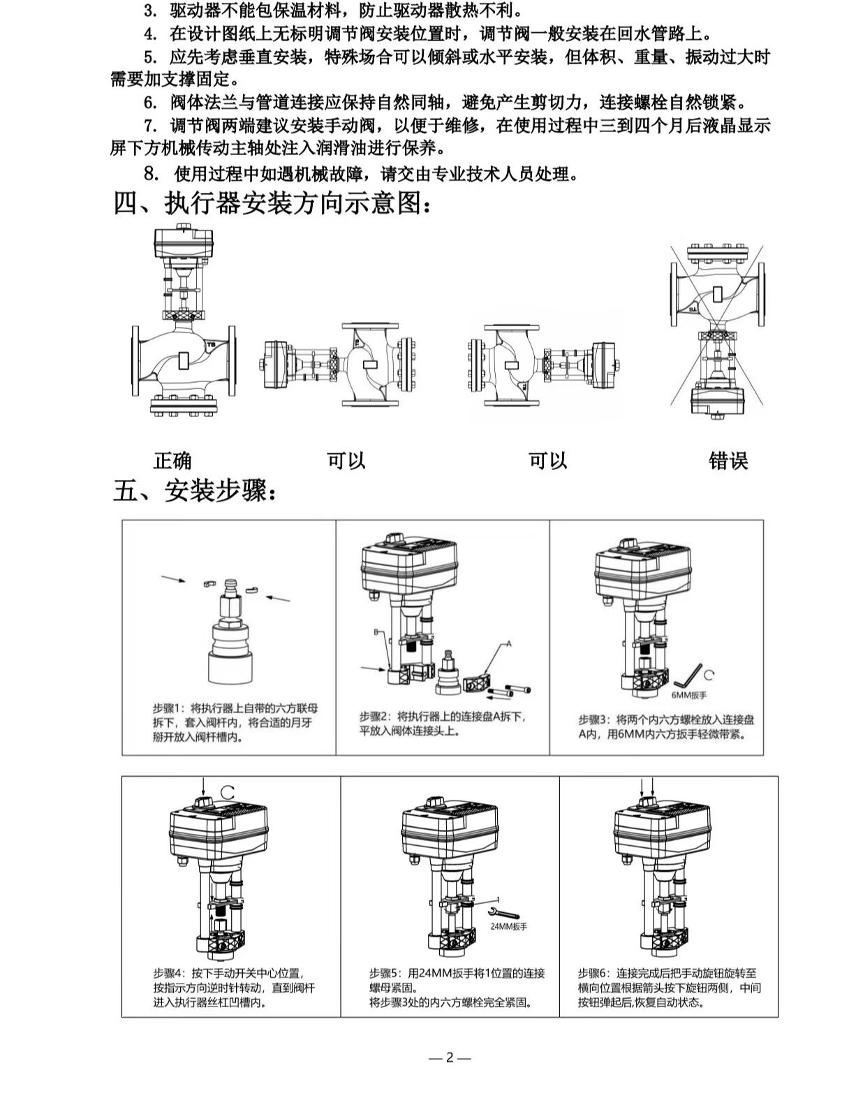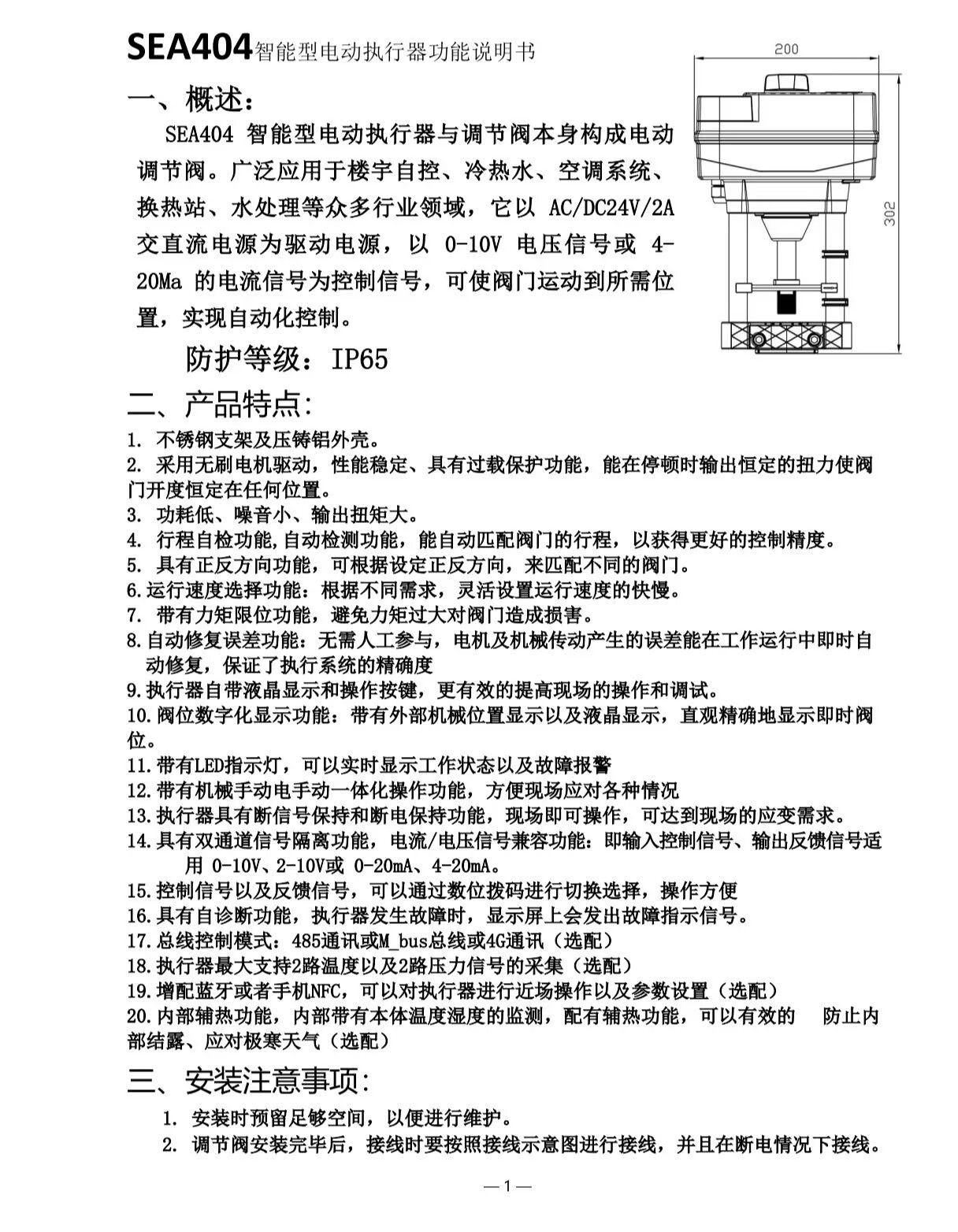 概述: SEA404 智能型电动执行器与调节阀本身构成电动 调节阀。广泛应用于楼宇自控、冷热水、空调系统、换热站、水处理等众多行业领域,它以 AC24/ DC24 /AC220V/2A交流电源为驱动电源,以0-10V 电压信号或 4-20Ma的电流信号为控制信号,可使阀门运动到所需位置,实现自动化控制。 防护等级:IP65 二、产品特点: 1.不锈钢支架及压铸铝外壳。 2,采用无刷电机驱动,性能稳定、具有过载保护功能,能在停顿时输出恒定的扭力使阀门开度恒定在任何位置。 3. 功耗低、噪音小、输出扭矩大。 4.行程自检功能,自动检测功能,能自动匹配阀门的行程,以获得更好的控制精度。 5.具有正反方向功能,可根据设定正反方向,来匹配不同的阀门。 6.运行速度选择功能:根据不同需求,灵活设置运行速度的快慢。 7.带有力矩限位功能,避免力矩过大对阀门造成损害。 8.自动修复误差功能:无需人工参与,电机及机械传动产生的误差能在工作运行中即时自 动修复,保证了执行系统的精确度 9.执行器自带液晶显示和操作按键,更有效的提高现场的操作和调试。 10.阀位数字化显示功能:带有外部机械位置显示以及液晶显示,直观精确地显示即时阀位。 11.带有LED指示灯,可以实时显示工作状态以及故障报警 12.带有机械手动电手动一体化操作功能,方便现场应对各种情况 13.执行器具有断信号保持和断电保持功能,现场即可操作,可达到现场的应变需求。 14.具有双通道信号隔离功能,电流/电压信号兼容功能:即输入控制信号、输出反馈信号适用0-10V、2-10V或 0-20mA、4-20mA。 15.控制信号以及反馈信号,可以通过数位拨码进行切换选择,操作方便 16.具有自诊断功能,执行器发生故障时,显示屏上会发出故障指示信号。 17.总线控制模式:485通讯或M bus总线或4G通讯(选配) 18.执行器*大支持2路温度以及2路压力信号的采集(选配) 19.增配蓝牙或者手机NFC,可以对执行器进行近场操作以及参数设置(选配) 20.内部辅热功能,内部带有本体温度湿度的监测,配有辅热功能,可以有效的防止内 部结露、应对极寒天气(选配)