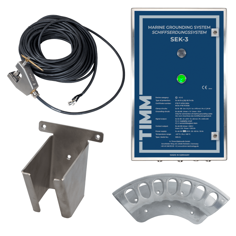 SEK-3安装在油轮和内河船的码头上。接地夹钳电缆长可达30m,须连接在船体平整的金属部件上,并与船体保持电气连接。SEK-3根据实践建议进行设计,符合欧洲2014/34/EU(ATEX)和国际IECEx标准,整个系统可用于1区和IIB气体组的危险区域。