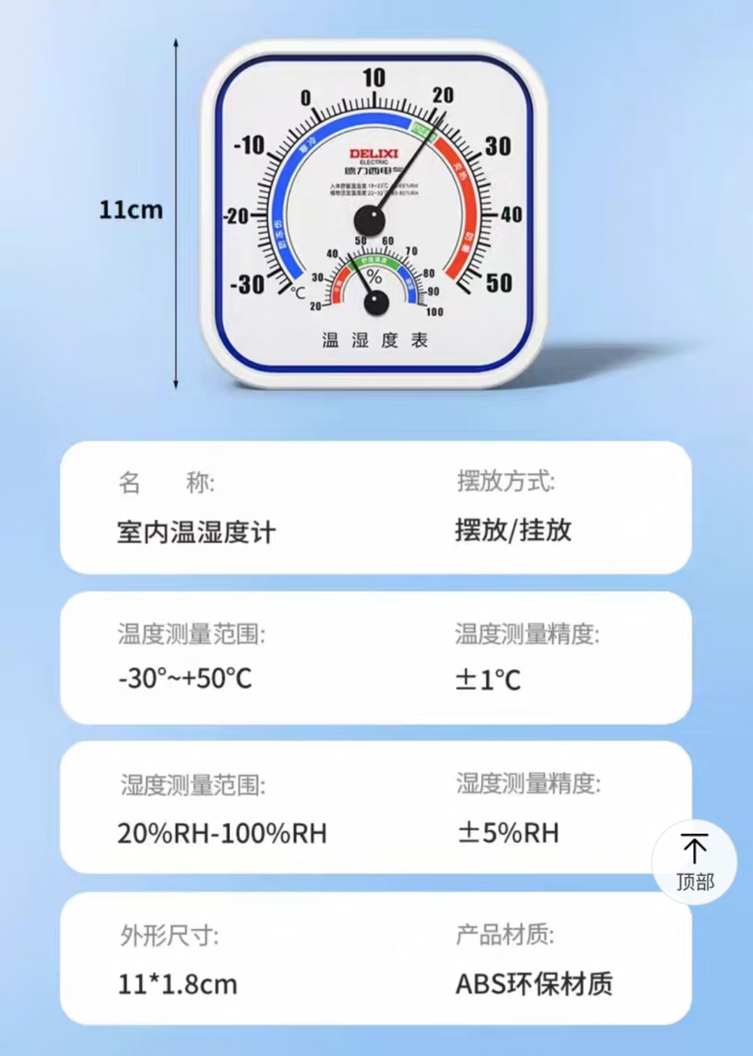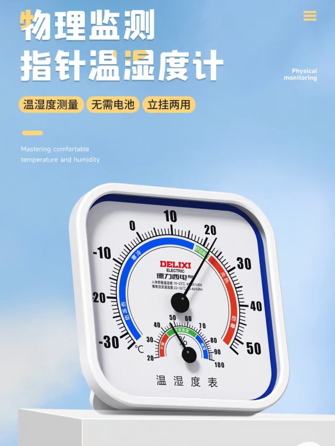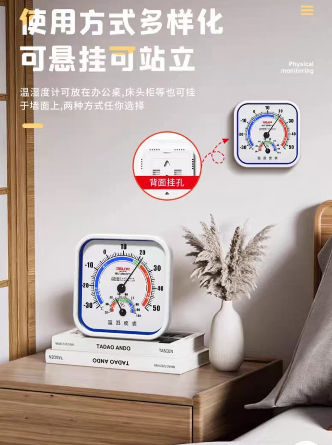 指针式温度、湿度指示。 上侧反映温度,下侧反映湿度。背部有挂孔,可悬挂/可站立。温湿度一目了然。 宽分刻度,易读清晰表盘。无需电池,机械感应测量更精确。