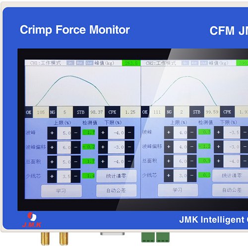 通道压力监测系统,采用不易受机械振动影响的波形读取方式,获取稳定的波形,和曲线分析压接效果,压接不良时触发报警,及时捕捉不良发生时的压力变化,在高精度检出不良的同时减少误判,以防止不良品流出去造成品质问题。