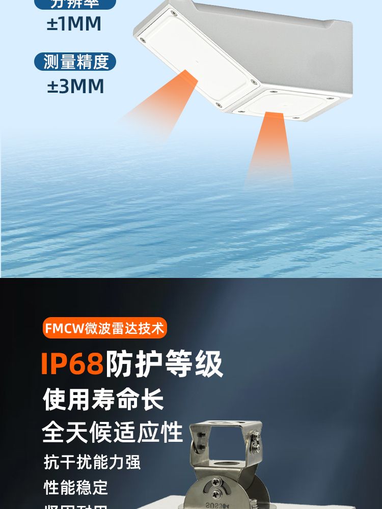 ※ 全天候高精度,利用FMCW微波雷达技术,不受温湿度、风雨、气泡及水位突变影响;