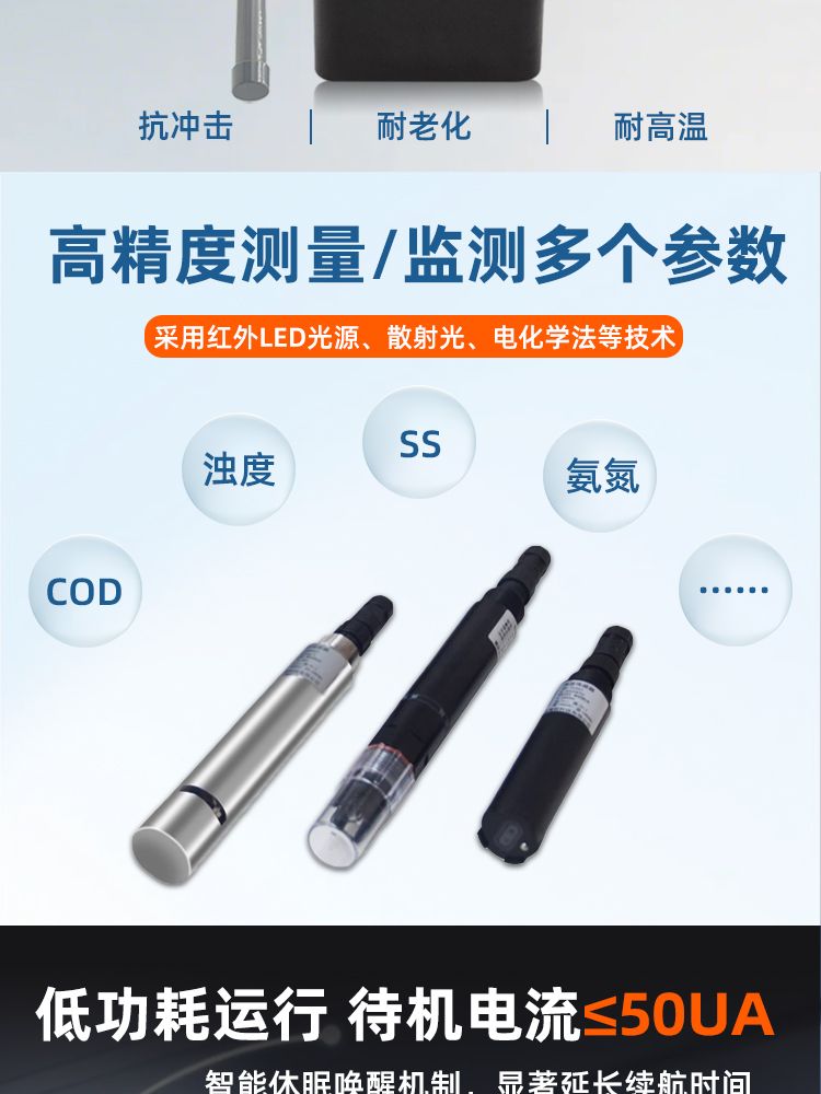 COD:量程0~500mg/L,精度±5%FS,分辨率0.1mg/L