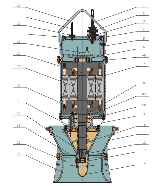 SAF型轴流潜水电泵和SMF型混流潜水电泵是传统的轴流泵和混流泵电动机机组的更新换代产品,驱动水泵的电动机是干式全封闭潜水三相异步电动机,该型潜水电泵可长期浸入水中运行,具有传统机组一系列无可比拟的优点。