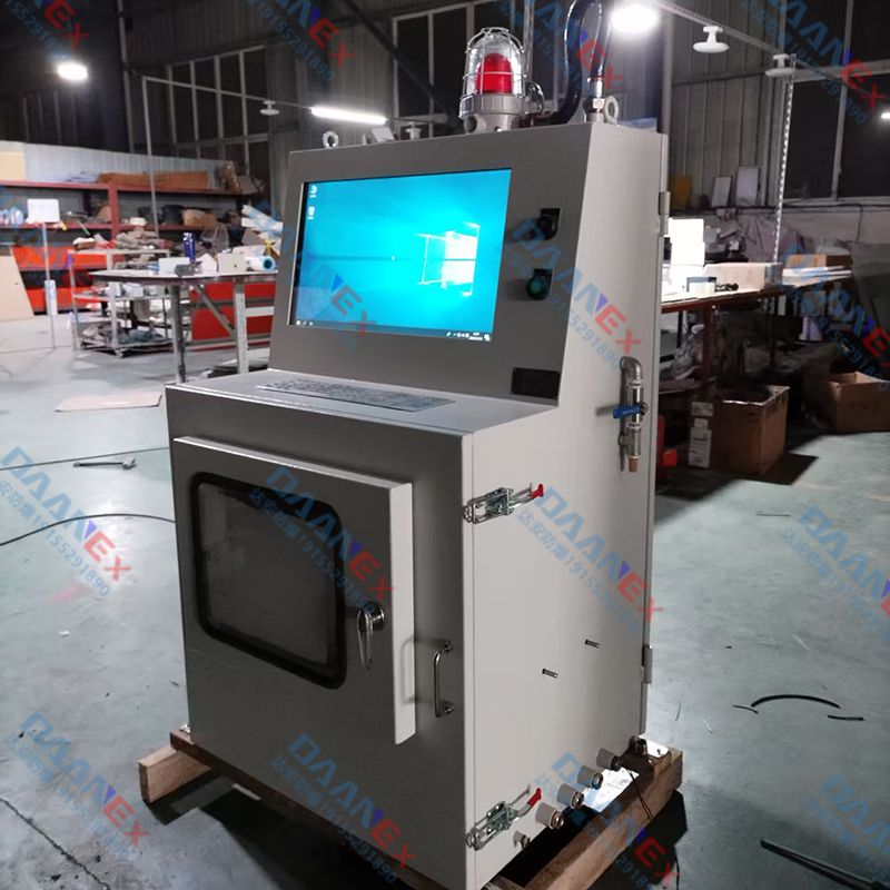 这是一台防爆正压型工控一体机(防爆电脑操作台),主要用于存在爆炸性气体或粉尘的危险工业环境中,作为人机交互和自动化控制的终端设备。
