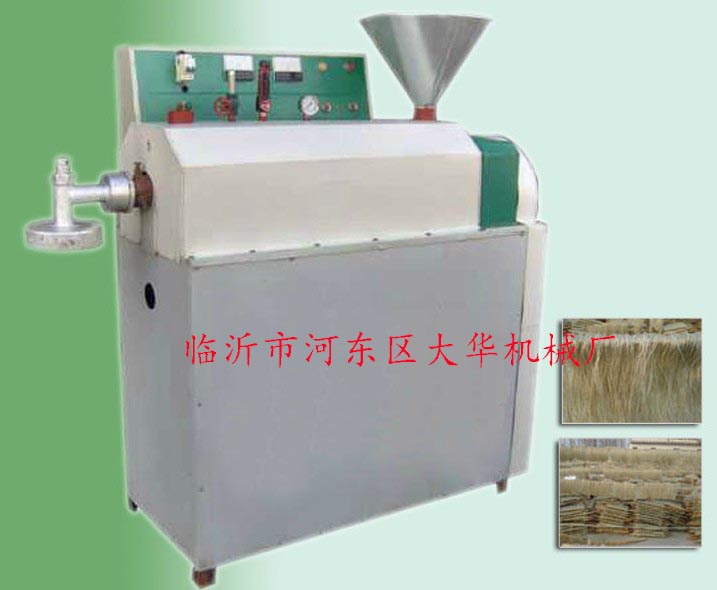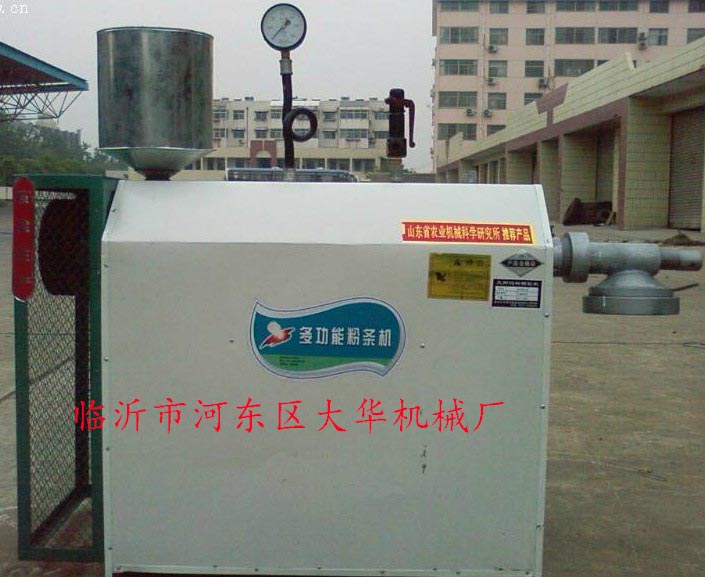 2.坚固耐用 无易损件 所用板材3毫米以上 纯正无缝钢管 厚4.5毫米以上 旋曲轴用45碳钢5指硬度,也有韧性车 滑易清洗 工作后用清水一冲即掉3.不分季节 何天均可生产 使阴雨连绵天也可生产 产出来的粉条如果在气温低的秀季节 几天半月堆在一起也没问题没有一点影响4.不分干 湿淀粉照样生产粉条5.粉做粉条不用打糊 比例加水搅拌即可 粉条耐煮有韧性 节省人力 两人即可操作机械6.用电极少 平均100斤粉条用电才3度工艺流程:预热→螺旋搅拌(恒温储料)→刮板下料成型→蒸熟(蒸汽)→冷却→脱离→常温老化→低温老化(冷库)→竖切丝→低温大风量定型干燥→降温(进冷风)→定长横切→包装。采用循环水加热、蒸汽导热、螺旋推进,使产品一次性成型、成熟,生产的粉丝、粉条、扁粉、粉皮耐煮,口感顺滑、洁白透明,外观指标独具特色。,配有可以用红薯淀粉、土豆淀粉、木薯淀粉、玉米淀粉、大米淀粉等加工粉条、粉丝、粉皮、川粉(苕粉)、火锅粉、肥羊粉等,尤其是玉米、大米淀粉经过科学配方生产,耐煮时间可在半小时以上,大大降低了粉条粉丝的生产成本,也解决了偏远地无土豆淀粉、红薯淀粉条的问题,每公斤淀粉出粉条、粉丝、扁粉、粉皮1.05-1.1公斤。粉条机操作方便,只需将淀粉和水按比例混合均匀后即可生产,免除了“调浆、打糊”等繁琐工序,减轻了劳动强度。大华机械粉条机加工产品外观洁白光滑、晶亮剔透、条直、粗细一致,耐煮不断条,口感爽滑、筋道循环水加热锅炉,使得水温得以恒定,保持水开便能进行生产,特有的夹层炉具,具有优良的节能保温性能,每小时用煤仅3公斤左右,该炉具还可用来链接玉米浸泡池,链接室内的暖气片。