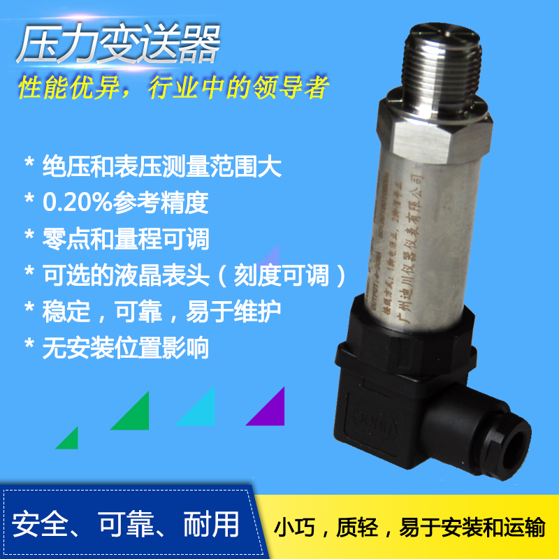 小巧型压力变送器采用高性能的感压芯片,配合先进的电路处理和温度补偿技术,将压力变化转化为线性的电流或电压信号。产品体积小巧,易于安装,采用不锈钢外壳隔离防腐,适于测量与接触部分材质相兼容的气体和液体等介质,它可以用来测量表压、负压和绝压。