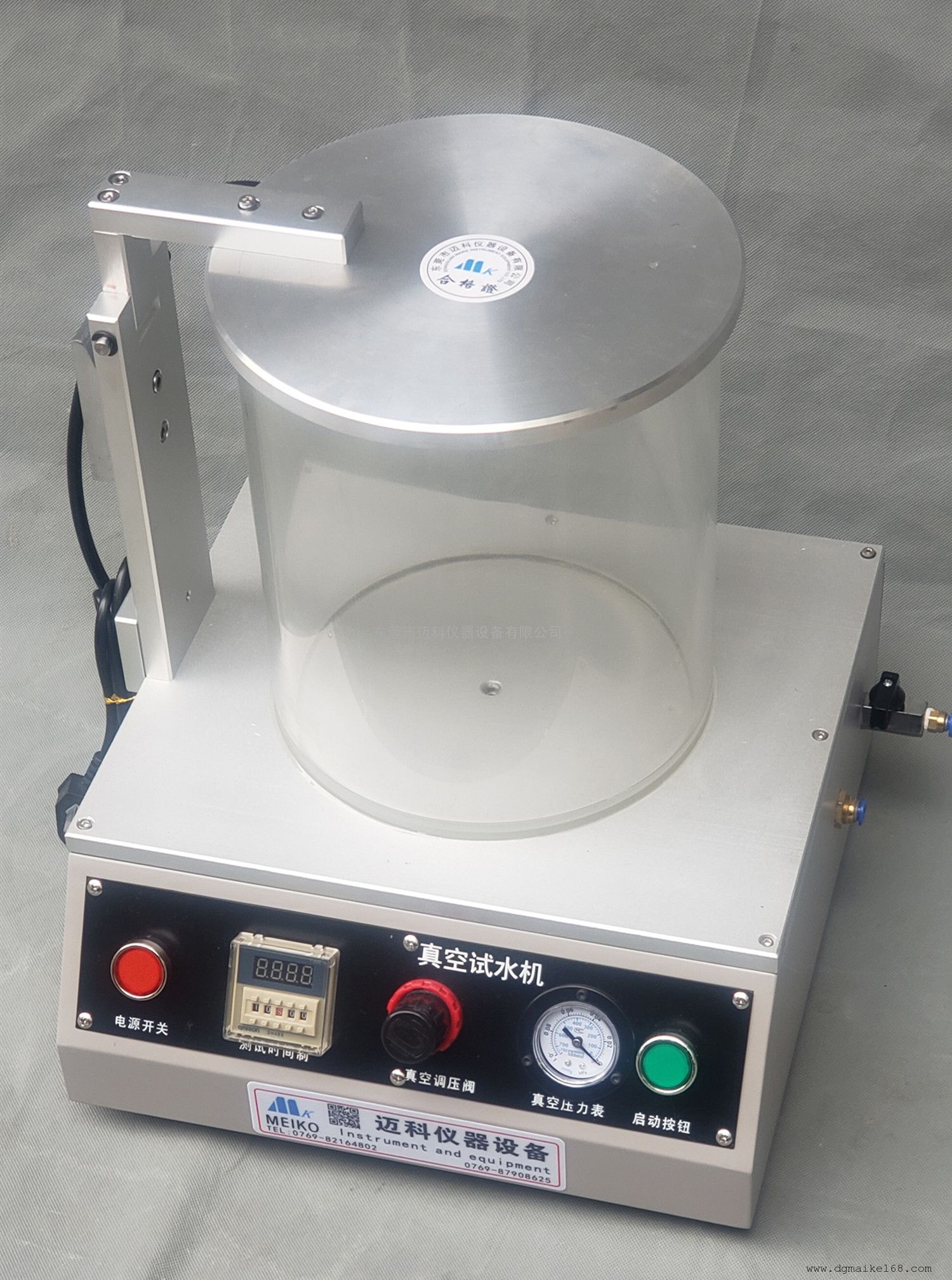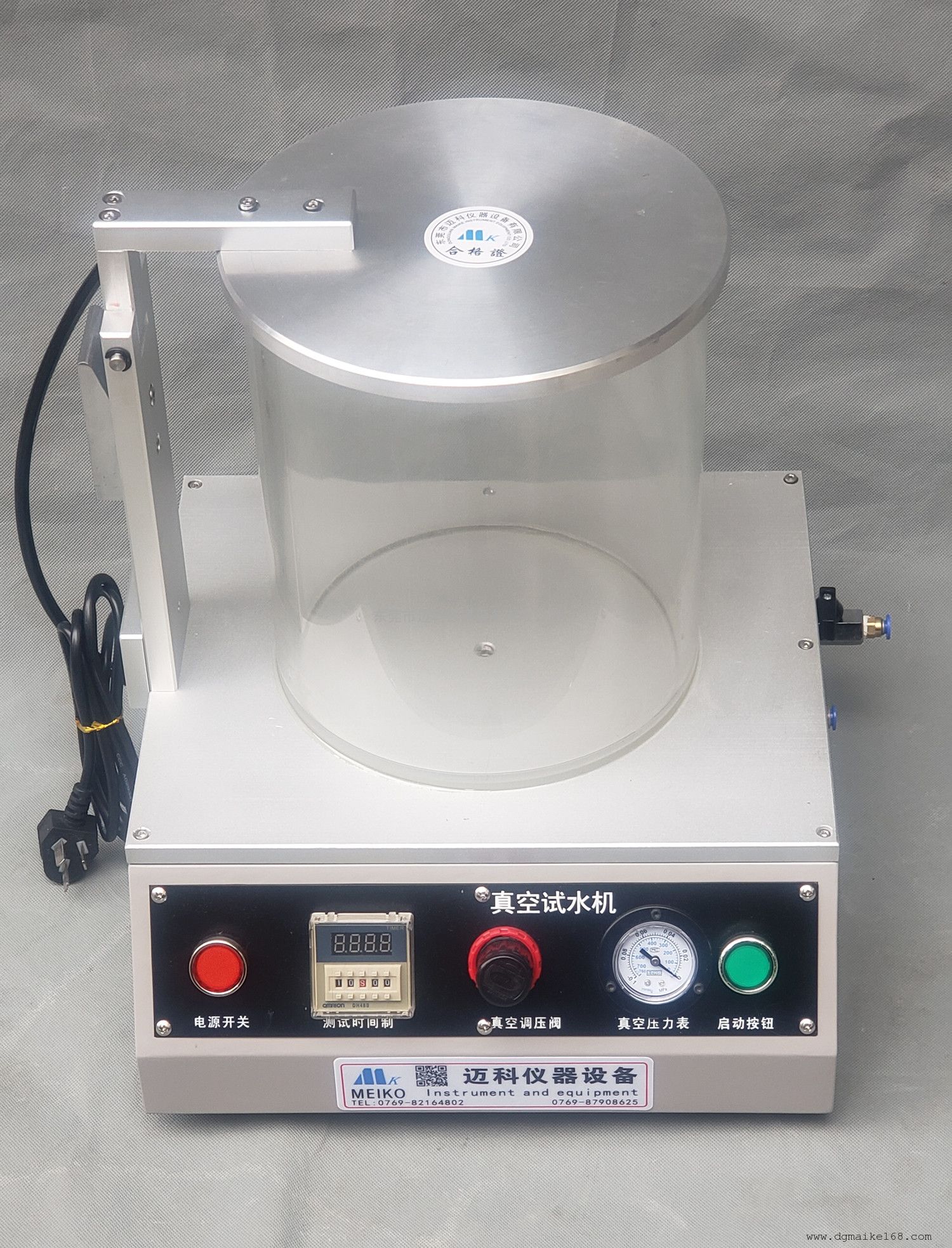 真空试水机用于音箱、望远镜、三防手机、钟表、手机、数码相机、玩具、镜头、电子产品等防水性能测试。设备是将产品放入水里,通过抽真空使密封腔产生负压值从而使产品内部与密封腔产生压力差,产品如果有泄漏的部位将会产生汽泡,通过对汽泡的观察来判断良品与不良品。