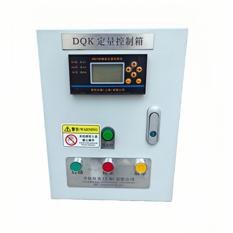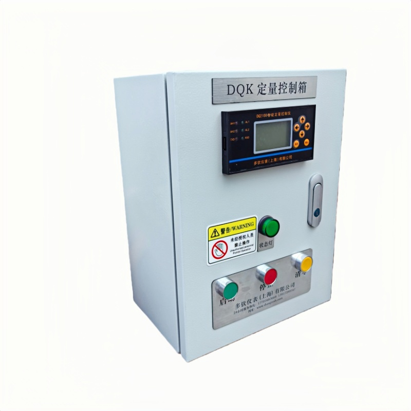 - DQK定量控制箱:内置智能定量控制仪、定制线路及组件,外置启停、清零按键与状态指示灯,标准尺寸400*300*200mm(高*宽*厚),供电可选DC24V或AC220V,可直接为传感器、断流设备供电。支持4-20mA、RS485信号输出,可对接其他设备,亦可加接打印
