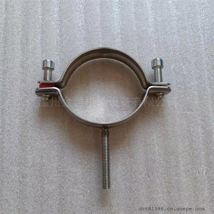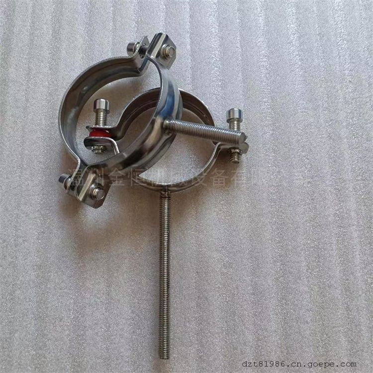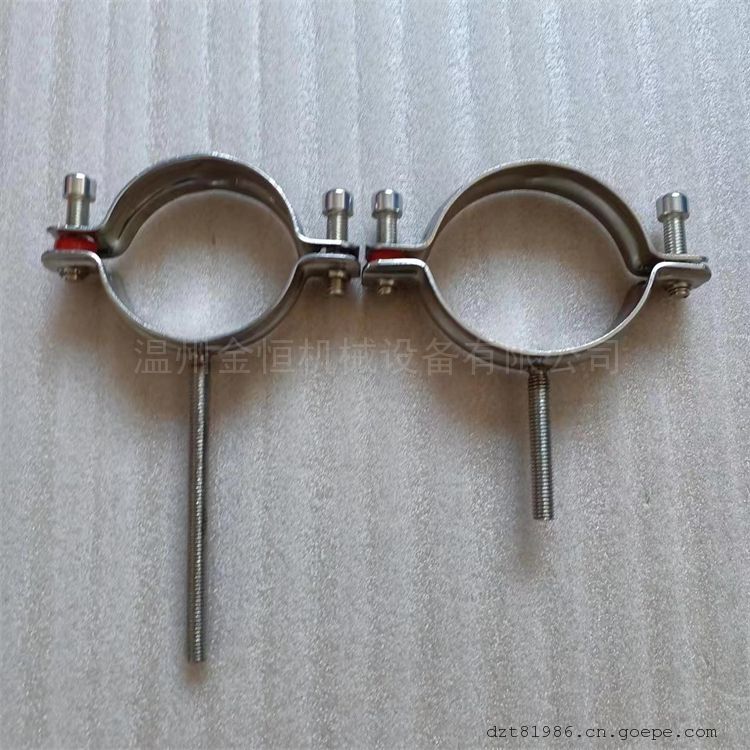 不锈钢管支架主要是由两个半圆不锈钢片、两个螺栓螺母、一个垫圈(一般为红色)和一个支撑的钢管组成。