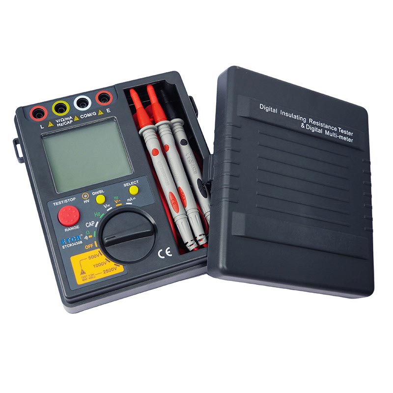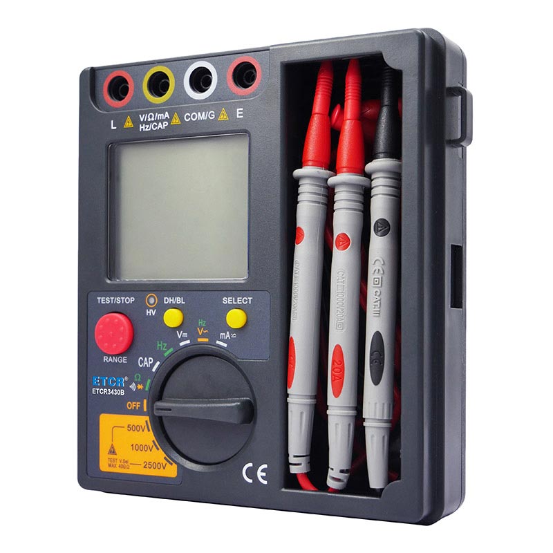 本产品是一款绝缘电阻万用表。其功能齐全,准确度高、操作可靠、使用方便。绝缘测试电压可切换。普通绝缘电阻表不能测量自身输出的高压,在绝缘电阻表输出高压不符合额定值时,用户不容易发现,以至有时测量结果偏差过大,造成安全隐患,可适时监测输出高压,用户在任何时候都能观察到仪表实际输出的测量电压,有效避免因输出电压不符合额定值要求而造成的误判。仪表测量范围*高可达到40GΩ,可根据需要设置测量时间,测量完毕后自动保持测量结果。数字多用表功能有交直流电压、电流、电阻、电容、频率、二极管及通断测量等,数字万用表功能和绝缘电阻表功能是完全分开的,在使用万用表功能时,不必担心会被绝缘电阻表产生的高压电击。本产品适用于测量变压器、电机、电缆、开关、电器等各种电气设备及绝缘材料的绝缘电阻,对各种电气设备进行保养维修、试验及检定。它结构精巧,携带方便,是您理想的电工、电子测试仪表。