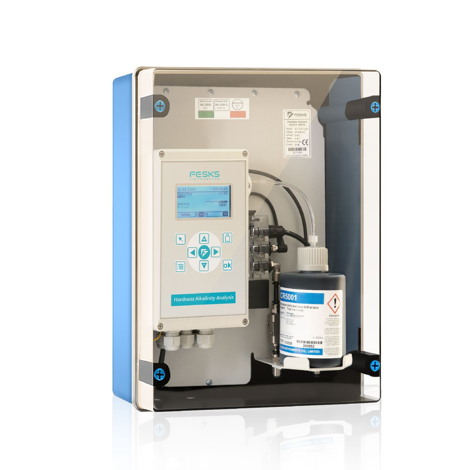 英国FESKS/费思克 水质在线总硬度分析仪FOSTCO 5000 IQ 采用滴定比色法、全自动、紧凑形设计,用于自动测定工艺水中的总硬度、残余硬度或碳酸盐硬度。仪器内置自校准程序,是一台可靠、准确、全自动的分析仪。