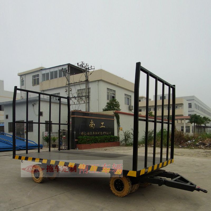 本平板拖车,额定承重11吨,有效承载面尺寸(长*宽):4M*2.3M,前后端带固定护栏。安装8条环保轮胎。