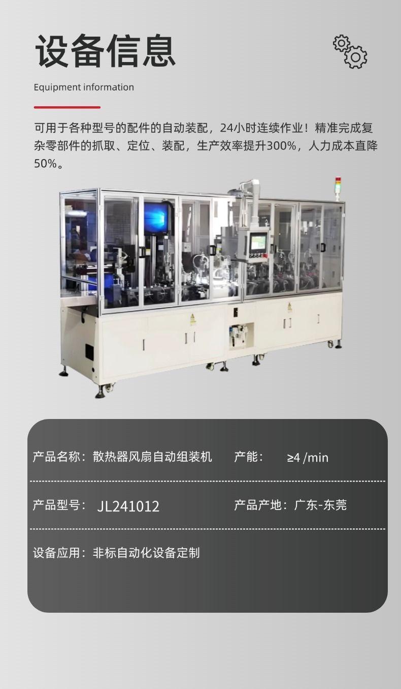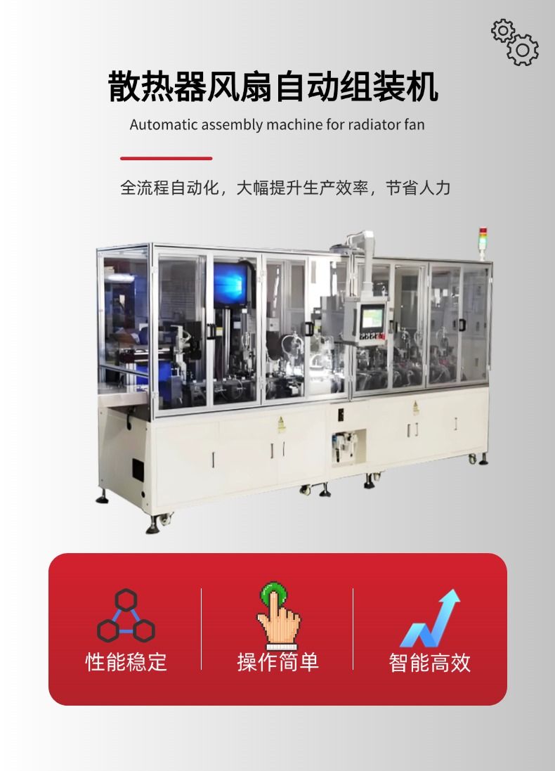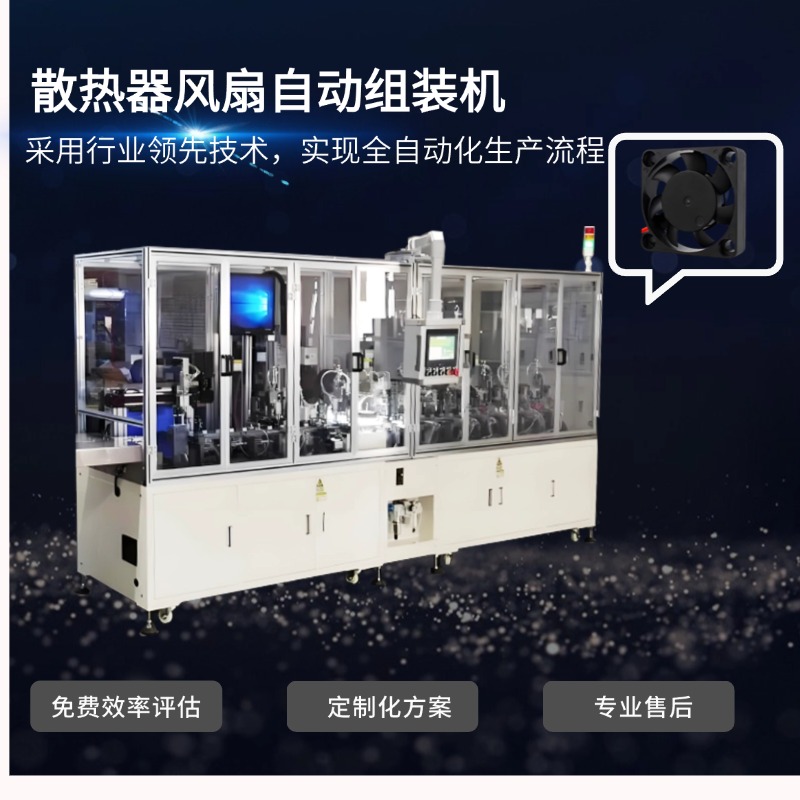 散热器风扇自动组装机是一种专用于散热器与风扇组件自动化装配的高效设备,广泛应用于计算机、家电、汽车电子、LED照明等领域的散热模块生产。通过自动化机械结构、精密传感控制系统和程序化操作,实现散热片、风扇、扣具、螺丝等部件的快速精准组装,显著提升生产效率和产品一致性。