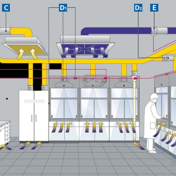 实验室通风系统一般由通风设备、通风管道、消声器、风机、控制系统组成。