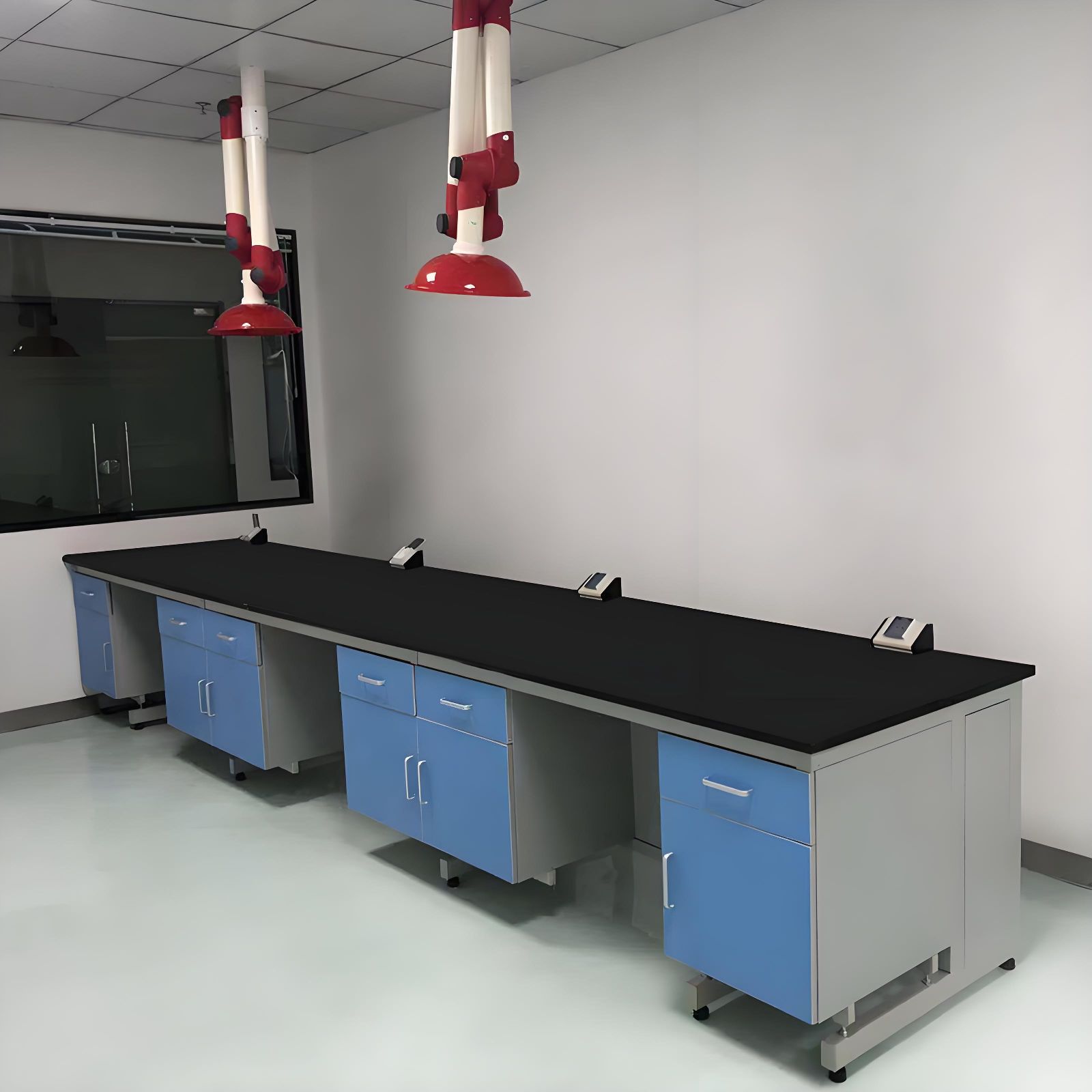 中央实验台可做岛形,四周都有走道便于工作人员活动并可以快速接近紧急设备或出口,当实验室两侧或两端有确定的出口时可采用半岛形实验台,而单间实验室通常采用靠墙实验台在中间留通道。内凹形工作台让工作人员长时间工作也会舒适,采用此方案,他们工作时可以使脚放在地上或脚位上以保持平衡,挺直身体,同时,人坐在内凹形实验台边,也可以为实验室留出更大的活动空间。
