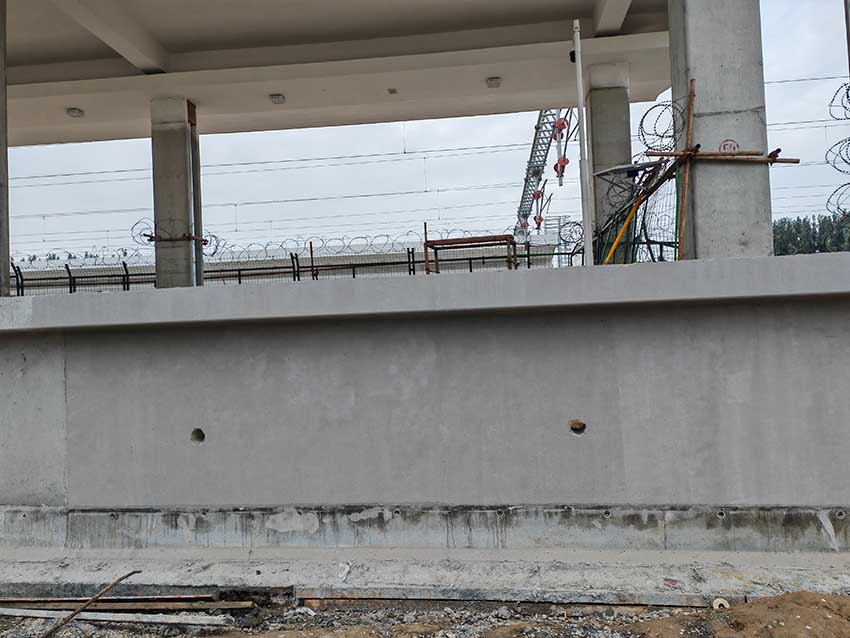 混凝土防碳化涂料是一种高性能防碳化改性的水泥基聚合物复合材料,含有共聚成分,在水泥中引起交叉反应链形成聚合物——水泥水化物的互传网络结构,产生化学与机械结合的内聚力与附着力,提高了拉伸强度和黏结强度,涂覆在混凝土表面并与之牢固粘结形成弹性涂膜保护层,可有效阻止环境中二氧化碳、氯化物、氧气和海水、酸雨等腐蚀介质对结构材料的侵蚀。该涂料由高性能聚合物助剂以及水泥基材料组成,涂层固化后是一种既有高分子材料的柔性,又有无机材料的高耐久性的新型保护封闭材料。