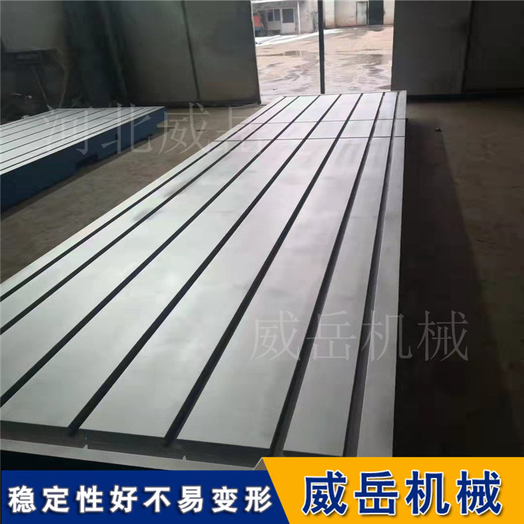 每台T型槽平台均有明确的额定负载(如2000mm×1500mm平台常见负载为5-8吨),使用前需确认工件及工装总重量不超过额定值,且避免集中负载直接作用于T型槽边缘或平台局部区域。严禁在平台上进行敲击、捶打等冲击性操作,如需校正工件,应垫置缓冲垫(如硬橡胶垫、铜垫),分散冲击力。