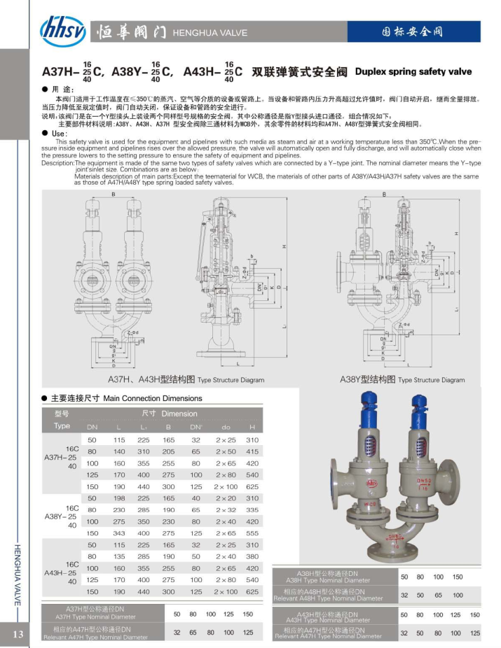A43H、A37H A38Y双联弹簧式安全阀适用于工作温度在≤350℃的蒸汽、空气等介质的设备或管路上。当设备和管路内压力升高超过允许值时,阀门自动开启,继而全量排放,当压力降低至规定值时,阀门自动关闭。保证设备和管路的安全进行。
