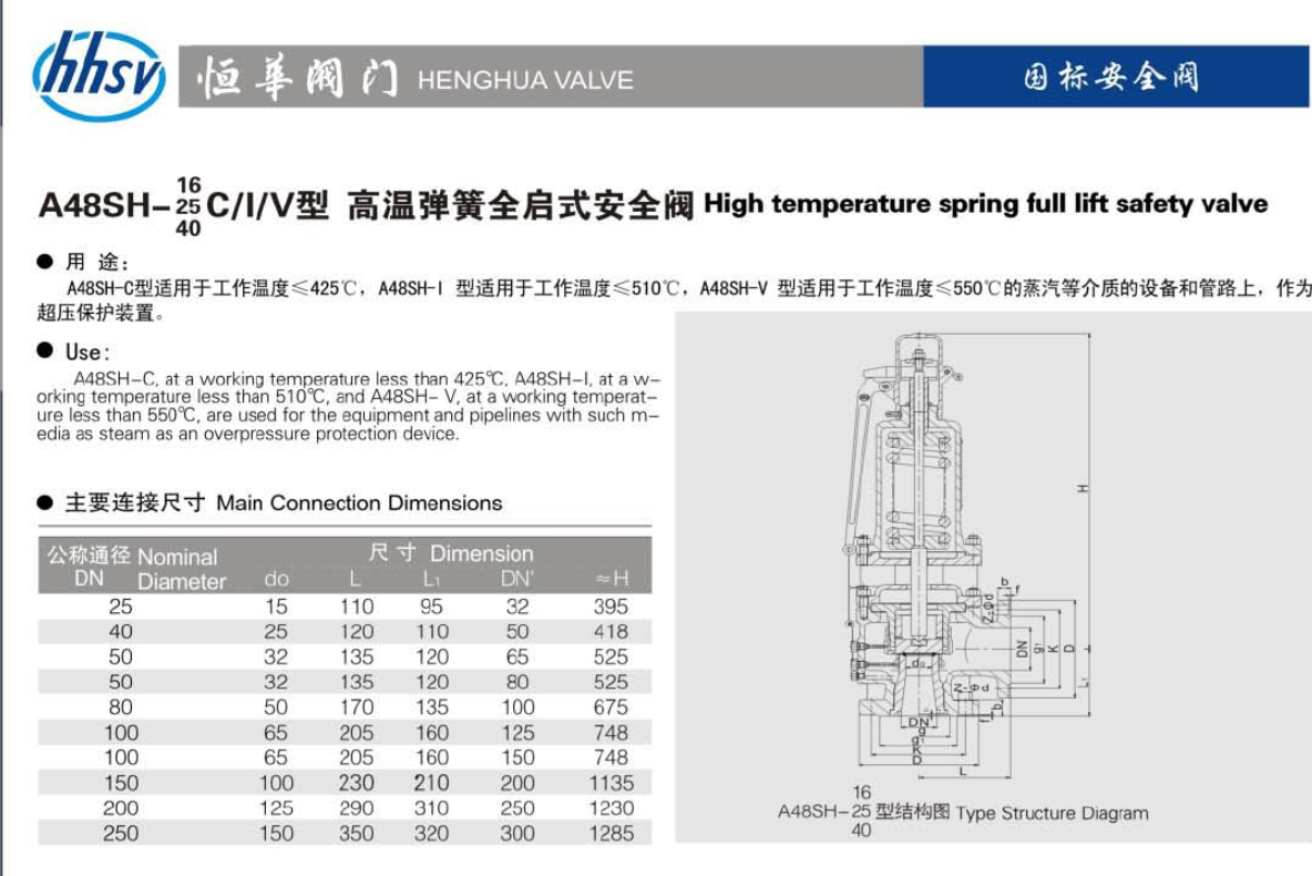 A48SH高温高压弹簧全启式安全阀适用于工作温度≤425℃,A48SH-I型适用于工作温度≤510℃,A48SH-V型适用于工作温度≤550℃的蒸汽等介质的设备和管路上,作为超压保护装置。