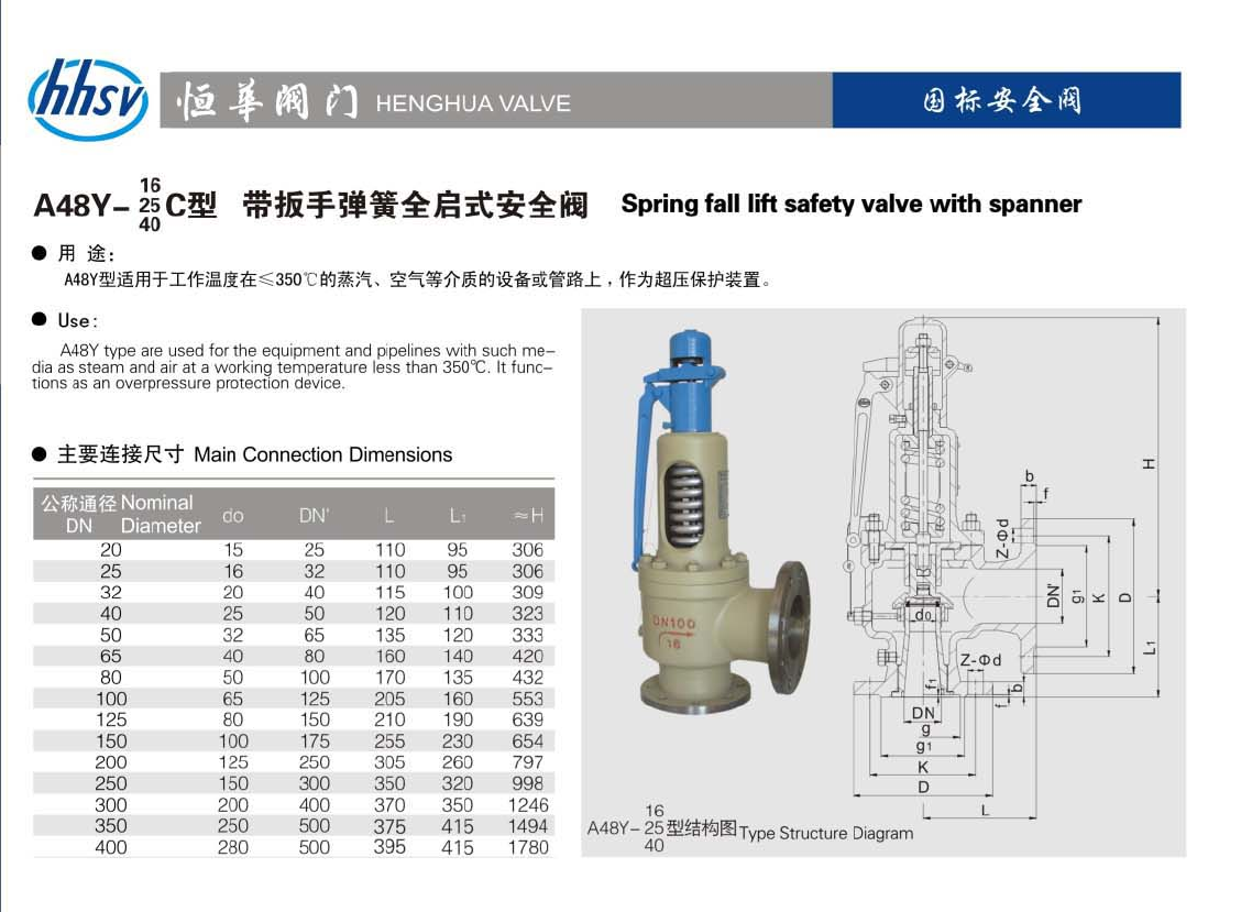 A48Y带扳手弹簧全启式安全阀适用于工作温度≤350℃的蒸汽、空气等介质的设备或管路上,作为超压保护装置。