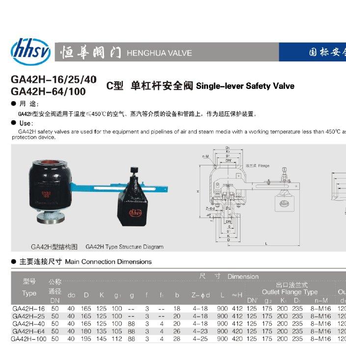 GA42H单杠杆安全阀适用于温度≤450℃的空气、蒸汽等介质的设备和管路上,作为超压保护装置。