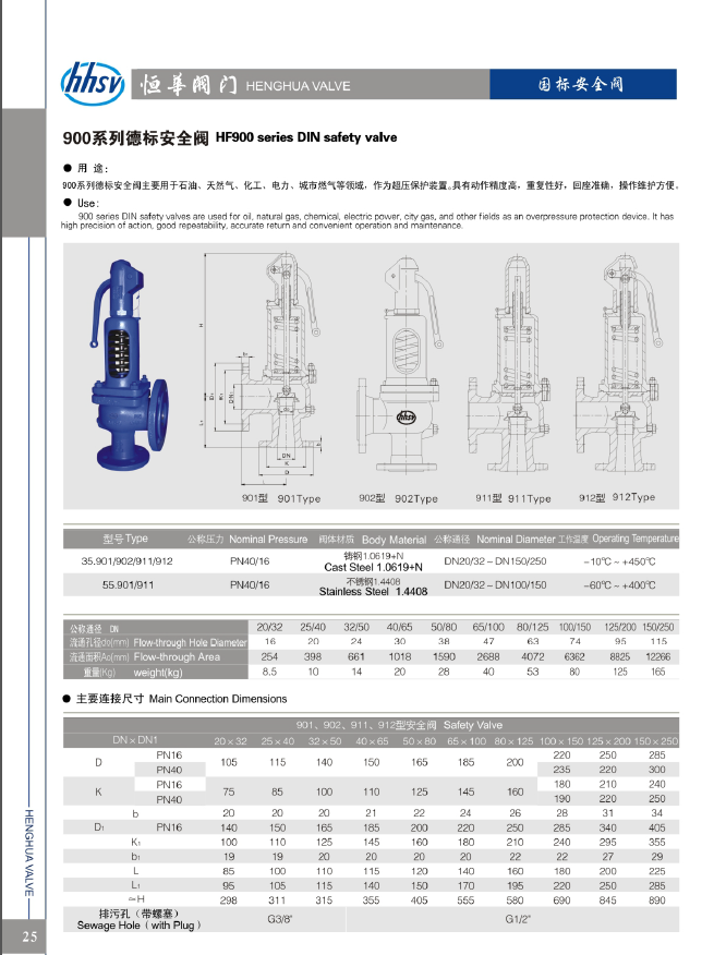 HFA900系列德标安全阀主要用于石油、天然气、化工、电力、城市燃气等领域,作为超压保护装置。具有动作精度高,重复性好,回座准确,操作维护方便。Nominal Press.: PN1.6MPa~PN4.0MPa;Nominal Dim.: 3/4''~8'';Temperature: -196℃ ~ 425℃