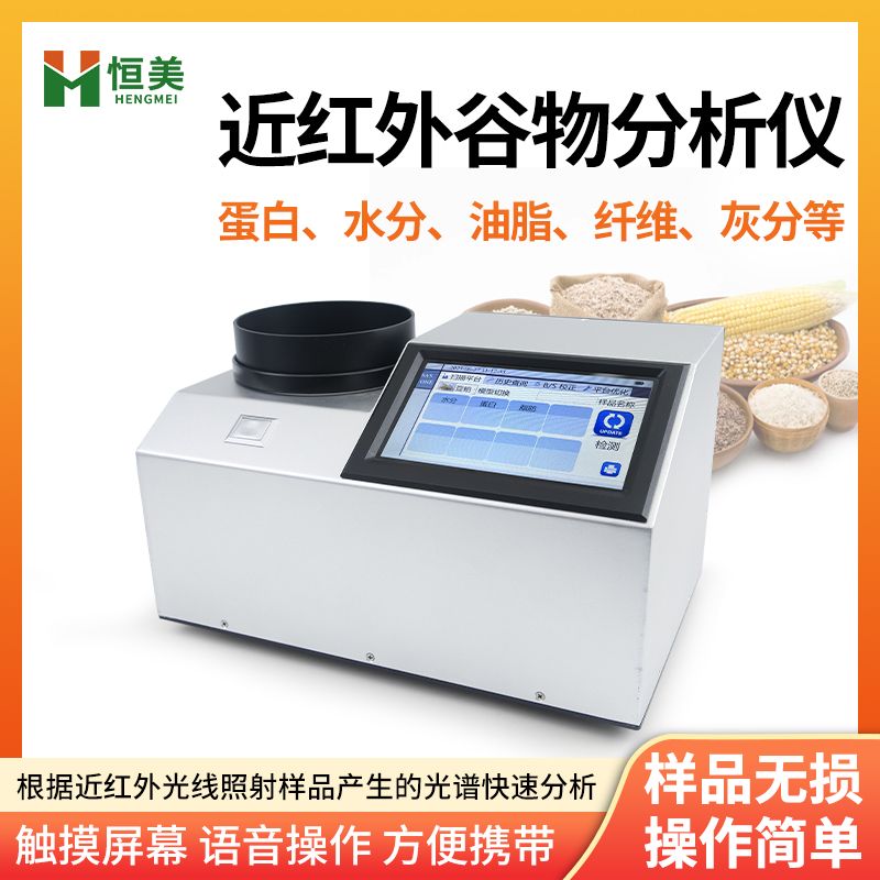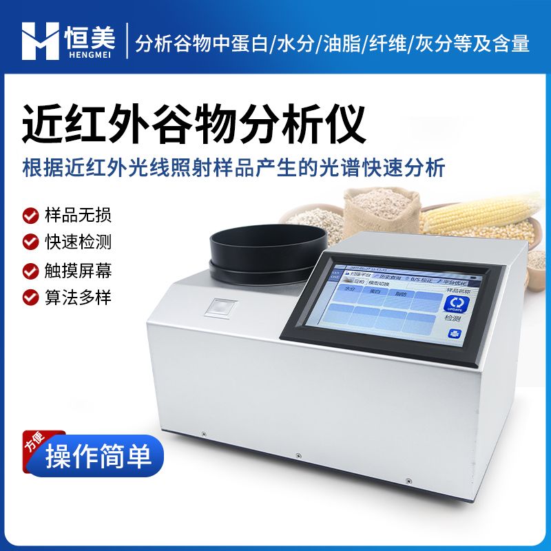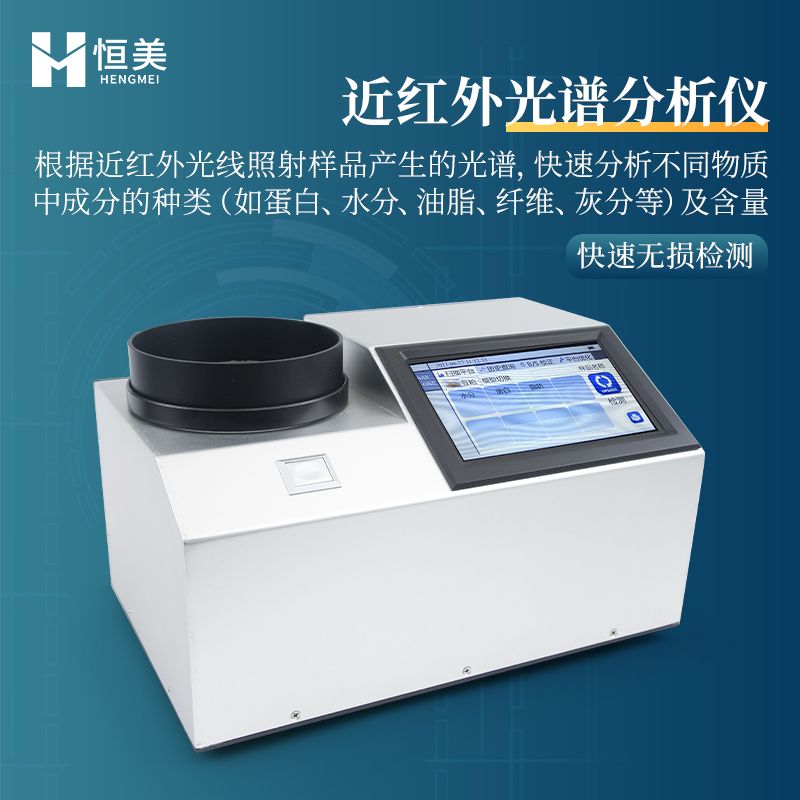 本仪器HM-GP200为近红外光谱分析仪,可以根据近红外光线照射样品产生的光谱,快速分析不同物质中成分的种类(如蛋白、水分、油脂、纤维、灰分等)及含量,并可根据客户需求添加模型。