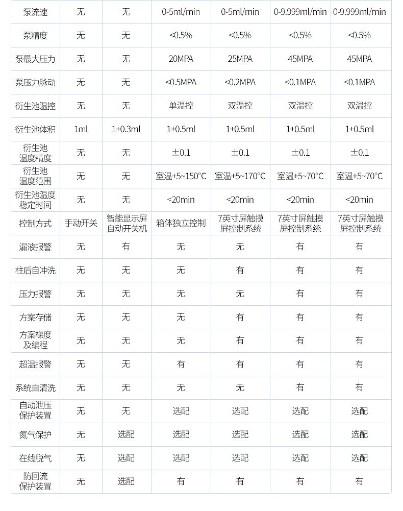 | 泵类型 | 无 | 无 | 普通平流泵 | 常规平流泵 | 高压平流泵 | 高压平流泵 |