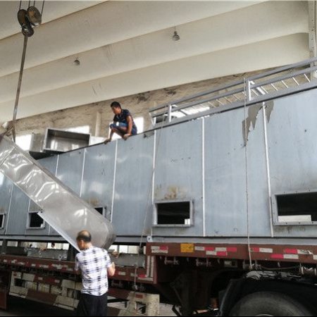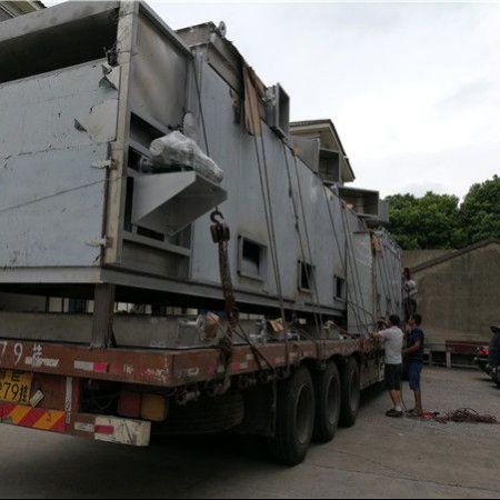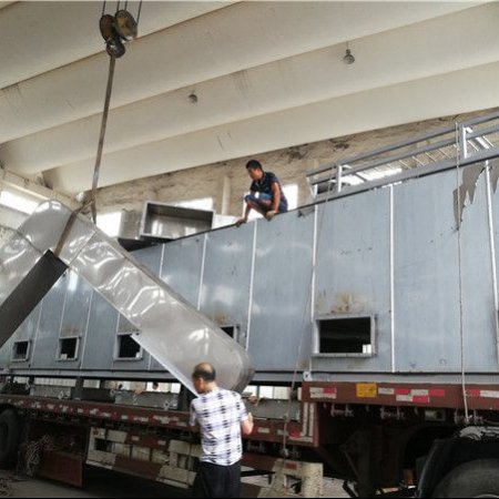 该机属厢式结构,厢内设有多层传送带,传送带在厢内循环运动,物料从料斗进入厢内,通过输送装置的匀料轮,使物料均匀分布在*层传送带上,通过链条的传动,由链翻倒入物料下层,下层反向交替逐一直翻到*后一层卸料。