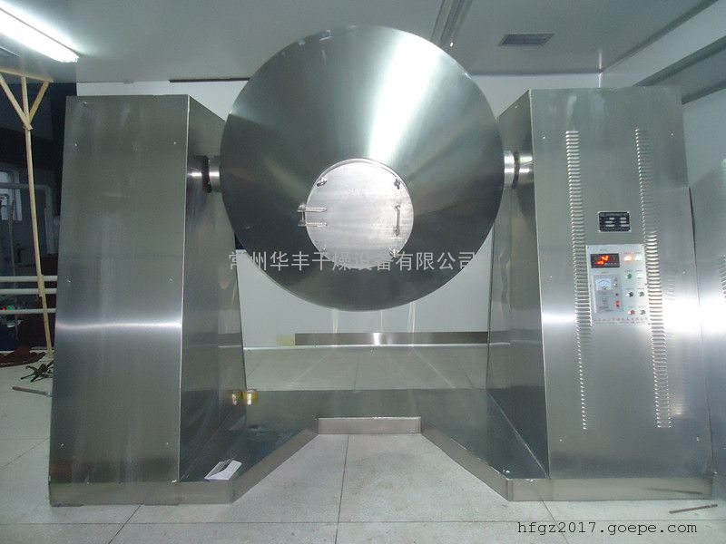 双锥回转真空干燥机是集混合干燥于一体的新型干燥机。将冷凝器,真空泵与干燥机配套,组成真空干燥装置。( 如不需回收容剂,冷凝器可不用)本机设计先进,内部结构简单,清扫容易,物料能全部排出,操作简便。能降低劳动强度改善工作环境。同时因容器本身回转时物料亦转动且器壁上不积料,故传热系数较高,干燥速率大、不仅节约能源,而且物料干燥均匀充分,质量好。可广泛应用于制药、化工、食品、染料等行业物料的干燥。符合药品管理规范“GMP”的要求。
