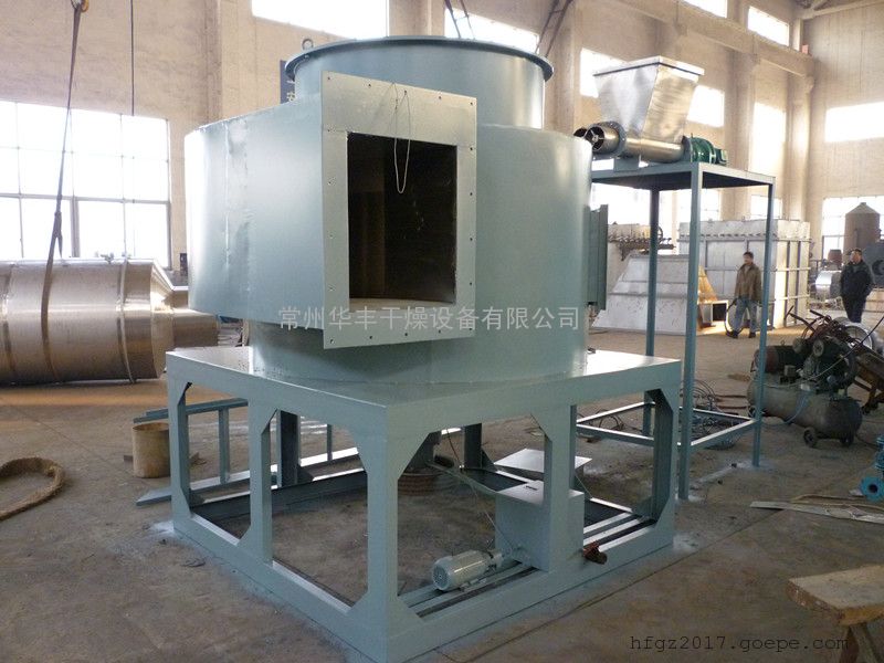 热空气切线进入干燥器底部,在搅拌器带动下形成强有力的旋转风场。膏状物料由螺旋加料器进入干燥器内,在高速旋转搅拌桨的强烈作用下,物料受撞击、磨擦及剪切力的作用下得到分散,块状物料迅速粉碎,与热空气充分接触、受热、干燥。脱水后的干物料随热气流上升,分级环将大颗粒截留,小颗粒从环中心排出干燥器外,由旋风分离器和除尘器回收,未干透或大块物料受离心力作用甩向器壁,重新落到底部被粉碎干燥。