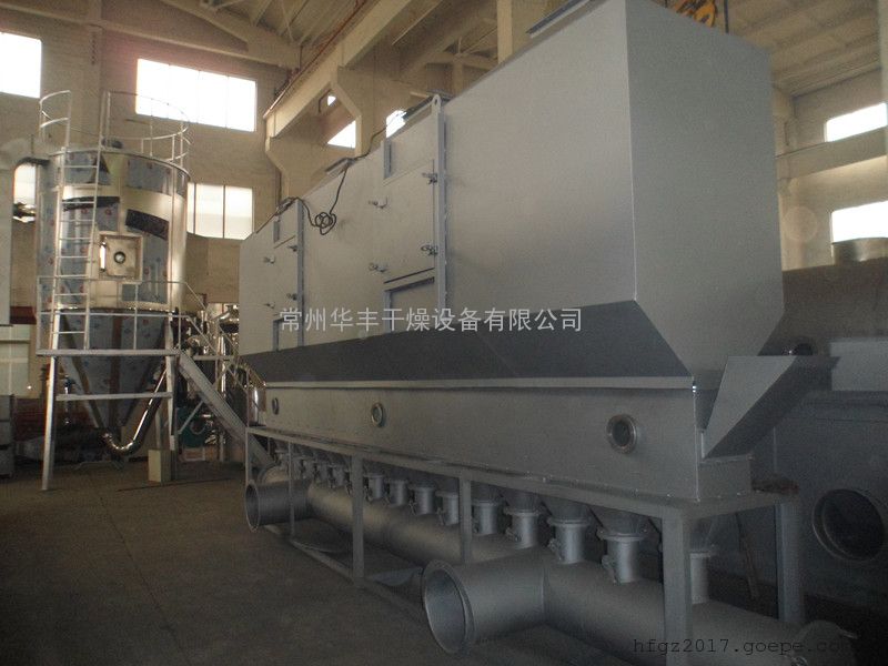 洁净的热风经阀板分配进入床体内,从加料器进入的湿物料被热风形成沸腾状态。由于热风与物料广泛接触,增强了传热传质的过程,因此在较短时间内就可干燥。如用连续型,物料从床体的一头进入,经过几十秒至几分钟沸腾干燥,自动从床体另一头流出。本设备一般进行负压操作。
