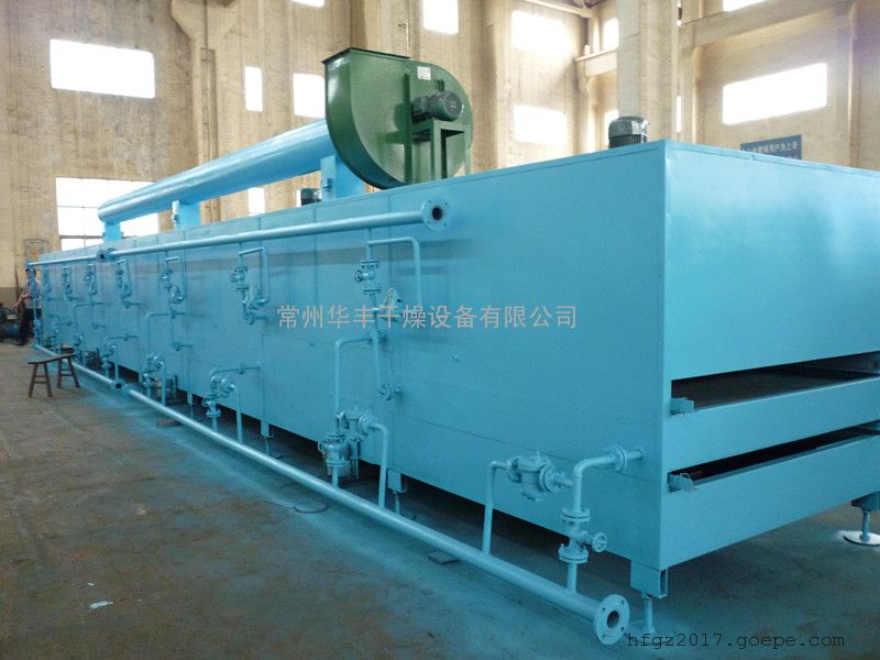 物料由加料器均匀地铺在网带上,网带一般采用12-60目不锈钢丝网,由传动装置拖动在干燥机内移动。干燥机由若干单元组成,每一单元热风独立循环,部分尾气由专门排湿风机排出,废气由调节阀控制,热气由下往上或由上往下穿过铺满物料的网带完成热量与质量传递的进程,带走物料水份。网带缓慢移动,运行速度可根据物料温度自由调节,干燥后的成品连续落入收料器中。上下循环单元根据用户需要可灵活配备,单元数量亦可根据需要选取。
