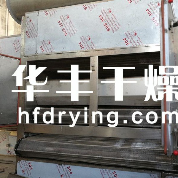 将刺梨均匀的平铺在网带上,网带采用12-60目的钢丝网带,由传动装置拖动在干燥机内往返移动,热风在物料间穿流而过,水蒸气从顶部排出,从而达到干燥的目的,箱体长度由标准段组合而成,为了节约场地,可将烘干机制成多层式,二层至6层根据用户需求定制。载热体由风机引入到烘干机内部,引风机产生的风速、风压使载热体充分、均匀的散布在烘干机底部,由于下部压力大于上面压力,载热体向上运动,穿过每层网带,使刺梨与载热体充分接触,提高烘干效率。