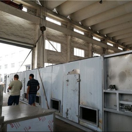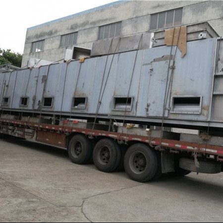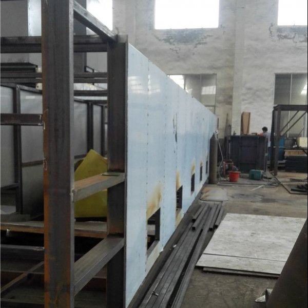 茶叶脱水带式干燥机属厢式结构,厢内设有多层传送带,传送带在厢内循环运动,物料从料斗进入厢内,通过输送装置的匀料轮,使物料均匀分布在*层传送带上,通过链条的传动,由链翻倒入物料下层,下层反向交替逐一直翻到*后一层卸料。蒸汽通过热交换器产生的干燥空气由风机底部向上分层吹击和逆流物料接触,进行传质传热,从而达到去除水份的目的。