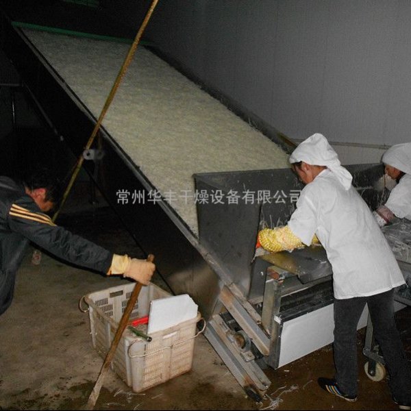 常州华丰干燥设备有限公司生产的萝卜丝干燥机,胡萝卜丝烘干机,紫薯专用烘干机、脱水蔬菜烘干机、脱水蔬菜干燥机是成批生产用的自动化连续式干燥设备,主要有带式输送机,漂烫机,蔬菜清洗机,自动上料机,干燥主机。燃煤热风炉,传动,控制系统等组成。具有自动进料,自动出料,自动控制的功能,热能用量少,生产效率高,操作简单,维修方便,适用范围广。可自动调温,自动调速,可适用于青梗菜、卷心菜、胡萝卜、黄瓜、南瓜、木薯片、青刀豆、蒜苗、中药材片、山药、枸杞、姜片、大葱、竹笋、芋籽等根茎、茎杆、茎叶类、果品类、槟榔、大枣、葡萄、枸杞、苹果片、猕猴桃片物料等多种蔬菜,药材,苹果类的脱水干燥,是目前脱水蔬菜行业自动化程度较高的干燥设备。对温度不允许高的物料尤为合适;改系列干燥机具有干燥速度快。蒸发强度高。产品质量高的特点。