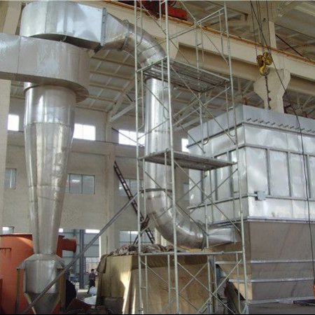 2.干燥气体进入干燥机底部,产生强烈的旋转气流,对器壁上物料产生强烈的冲刷带出作用,消除粘壁现象。在干燥机低部高温区,热敏性物料不与热表面直接接触,并装有特殊装置,解决了热敏性物料的焦化变色问题。