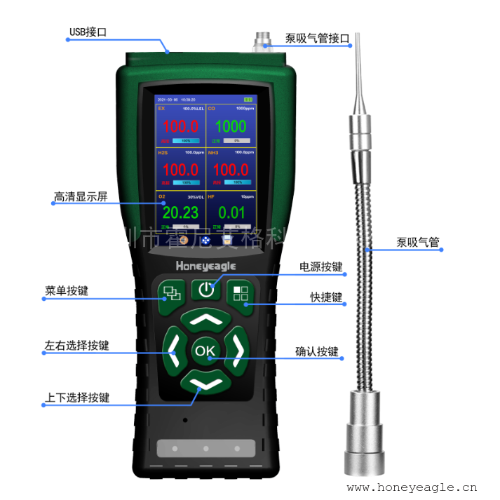 仿真图标显示菜单功能,内置泵吸式测量。气体检测仪的防护级别 IP66,可以