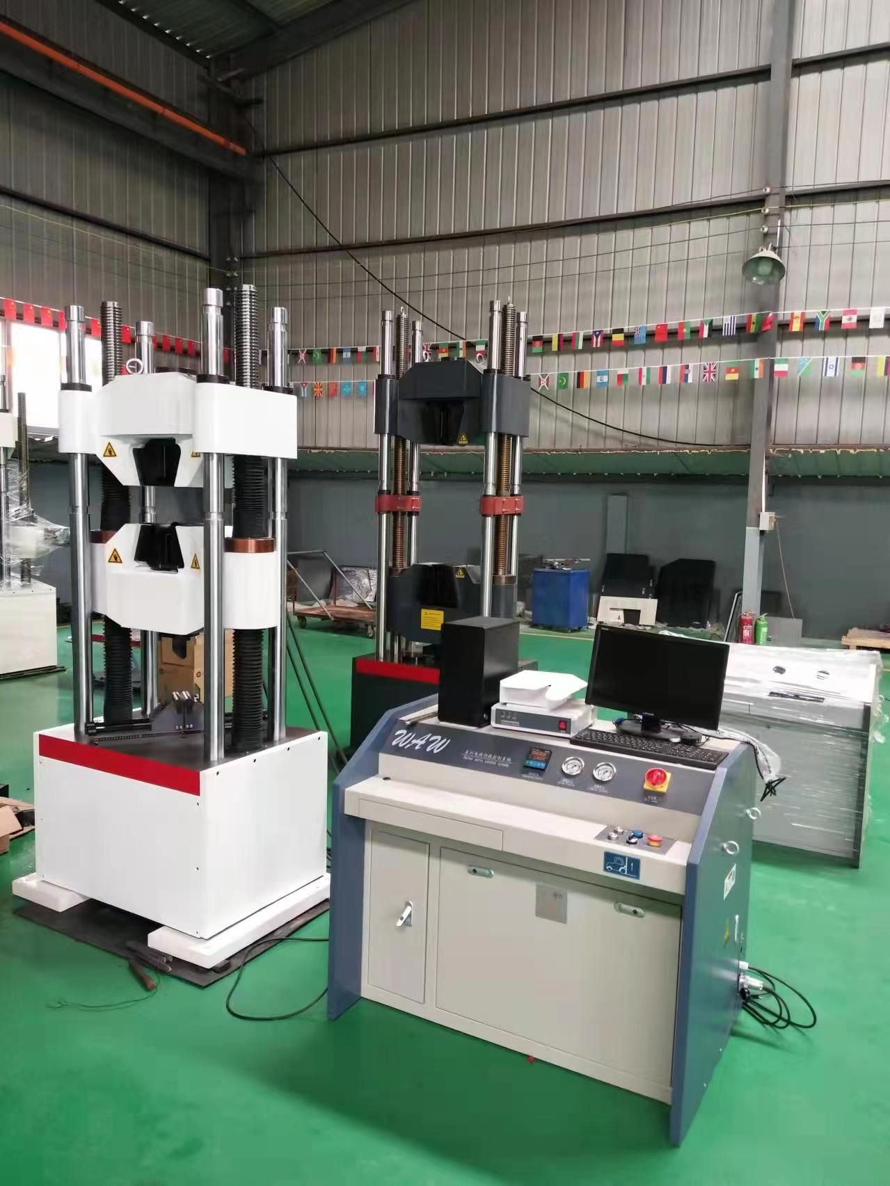 本试验机根据国标GB/T 16826-2008 《电液伺服万能试验机》设计与制造。由主机部分、油源部分(液压动力源)、测控系统、附具部分四部分组成。采用微机控制伺服阀控制加载过程,高精度抗震性负荷传感器测量力值、高精度电子引伸计测量变形、高精度拉线编码器测量位移,专用精密控制器采集、处理试验信号,专用测试软件计算试验数据,微机显示存贮试验结果及曲线。