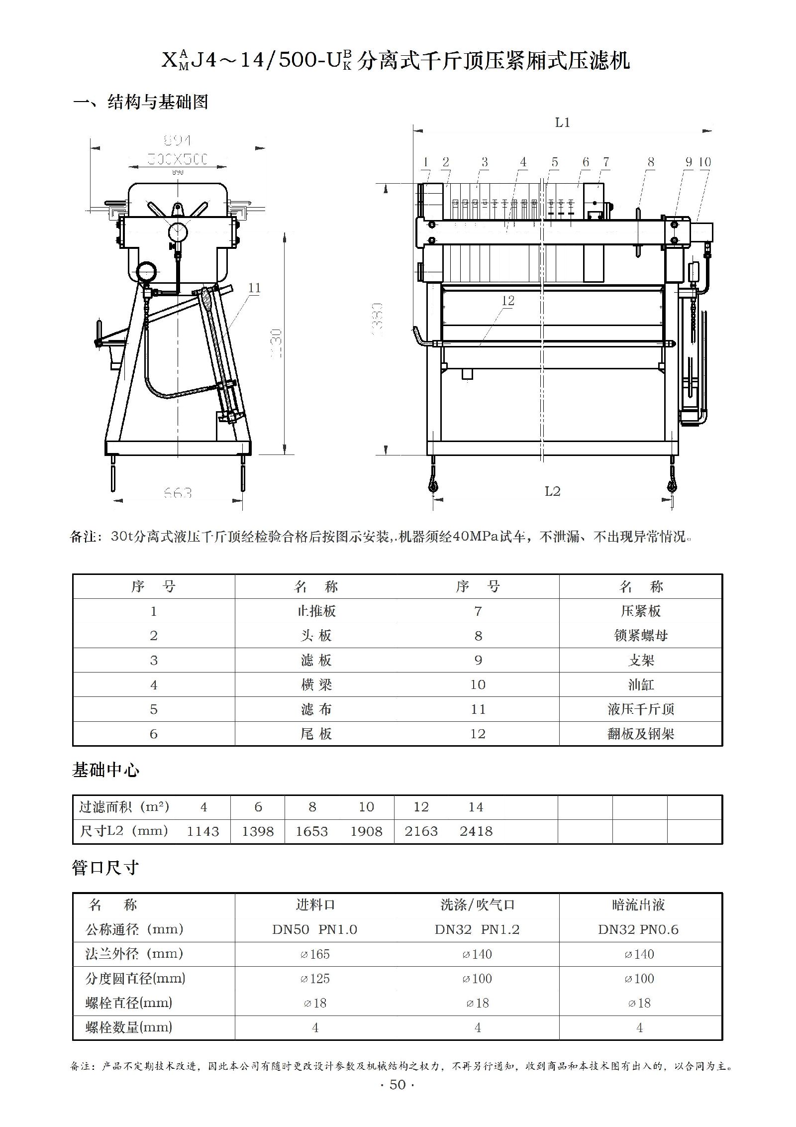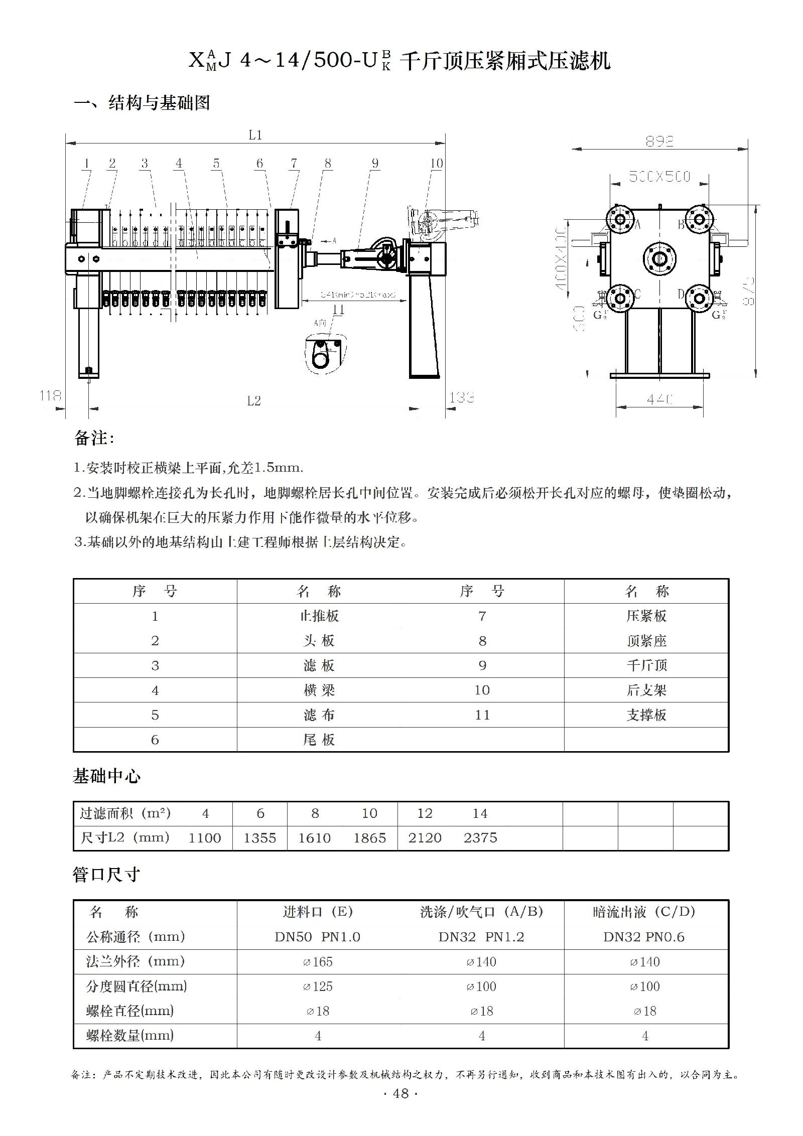 厢式、板框式压滤机是悬浮液固、液两相分离的理想设备。该系列压滤机为手动(千斤顶)压紧机型和液压压紧机型。滤板尺寸500mm×500mm,该系列全部为厢式滤板。压紧方式:S 为手动丝杆型;J为手动千斤顶型;Y 为液压型;见图1-5, 机器结构简便,操作易行。该系列压滤机主要规格有:手动型:XAMS4~14 / 500- U BK-Ⅰ; 千斤顶型:XAMJ4~14 / 500- U BK-Ⅰ;液压型:XAMY4~14 / 500- U BK-Ⅰ; 自动型:XAMZ 4~14 / 500- U BK该系列压滤机机型较小,压紧、卸料均可手动操作,也可根据用户需要制成液压压紧和自动拉板。压滤机有明流、暗流之分,它们各自又有滤饼的可洗式和不可洗式;