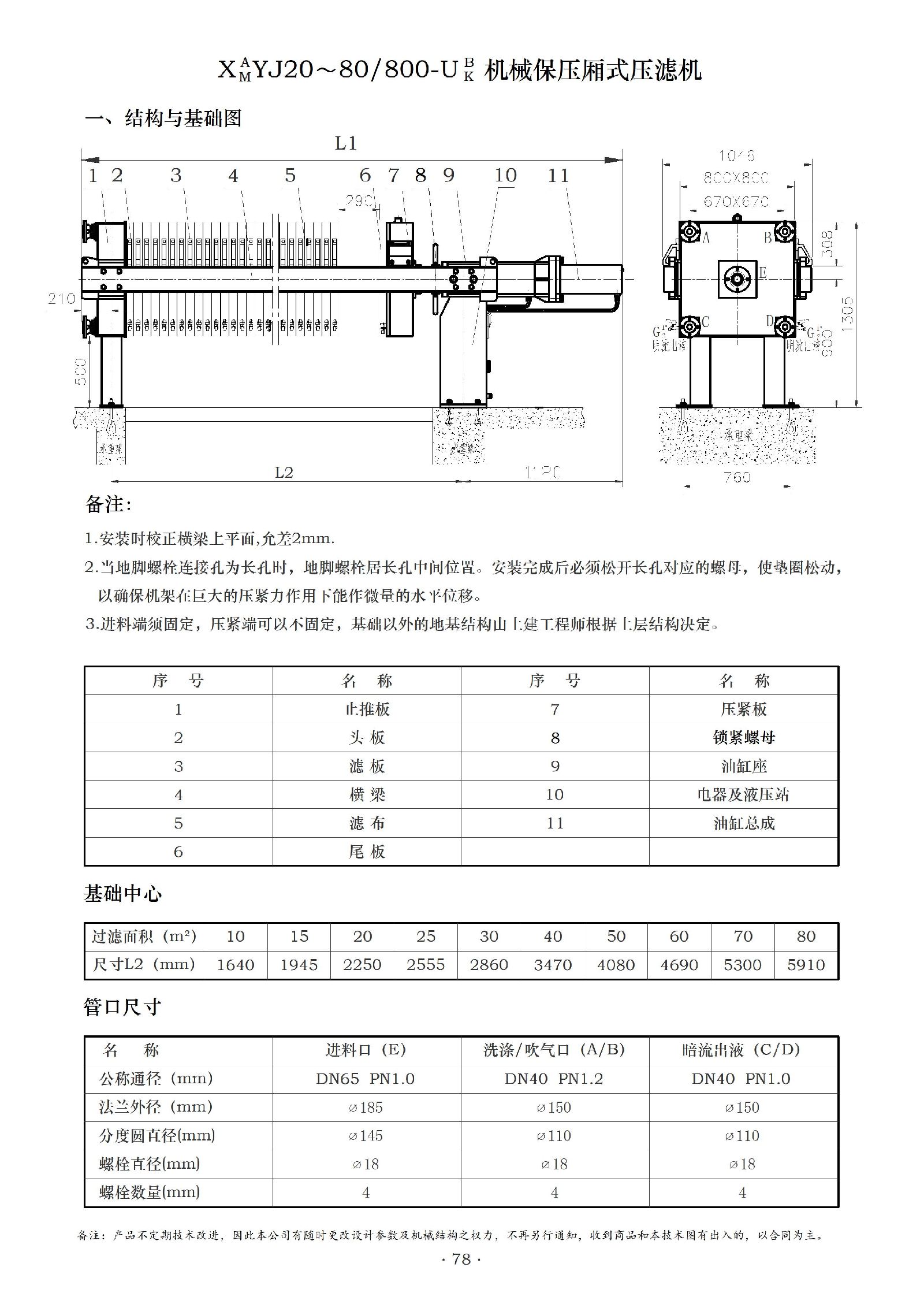 过滤面积可选:型号中的“20-80”代表过滤面积,该系列压滤机的过滤面积有20㎡、30㎡、40㎡、50㎡、60㎡、70㎡、80㎡等多种规格可供选择,能满足不同生产规模和处理量的需求。